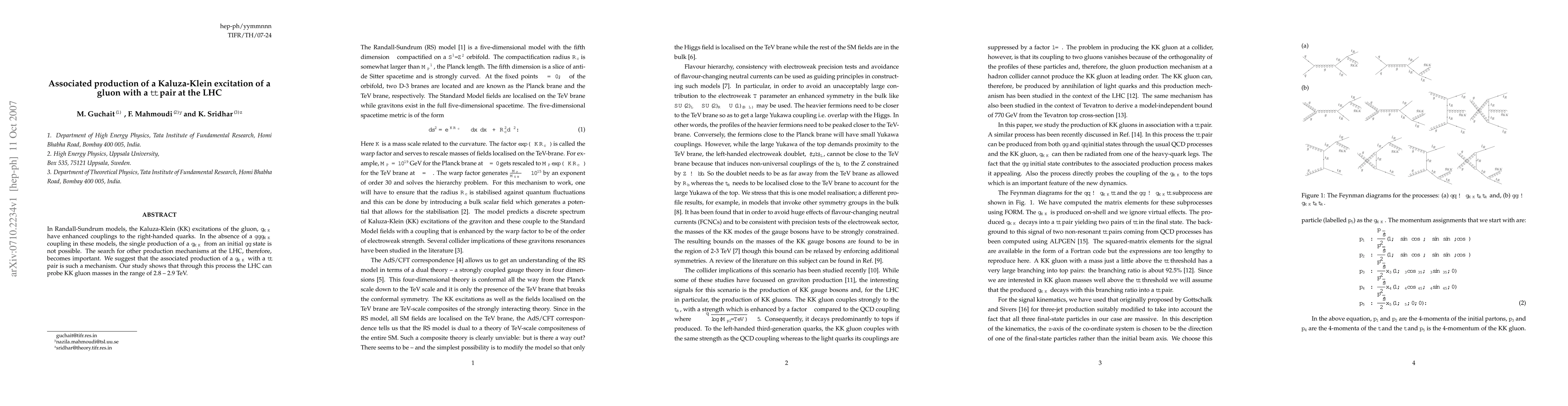 This paper explores the associated production of a Kaluza-Klein gluon excitation, g_{KK}, with a top-quark pair in the context of Randall-Sundrum models at the LHC, suggesting it as a viable production mechanism. The study indicates that this process can probe KK gluon masses within the range of 2.8 to 2.9 TeV.