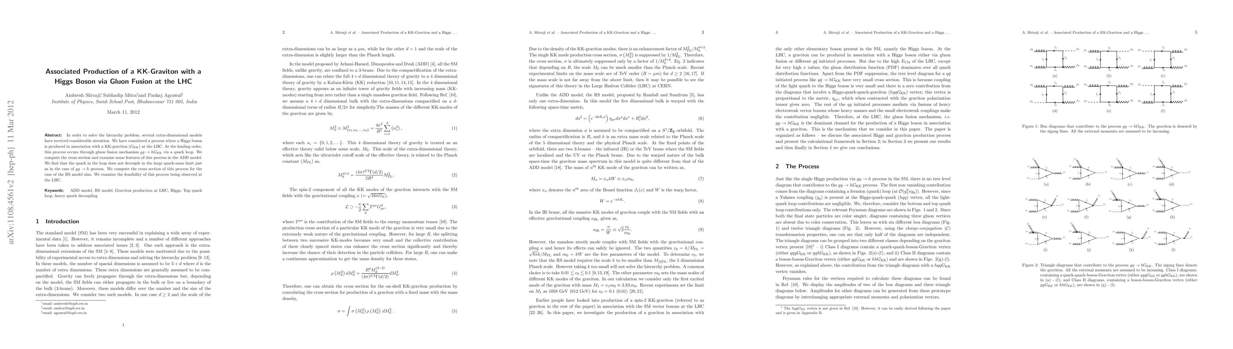 In order to solve the hierarchy problem, several extra-dimensional models have received considerable attention. We have considered a process where a Higgs boson is produced in association with a KK-graviton ($G_{\rm KK}$) at the LHC. At the leading order, this process occurs through gluon fusion mechanism $gg \to h G_{\rm KK}$ via a quark loop. We compute the cross section and examine some features of this process in the ADD model. We find that the quark in the loop does not decouple in the large quark-mass limit just as in the case of $gg\to h$ process. We compute the cross section of this process for the case of the RS model also. We examine the feasibility of this process being observed at the LHC.