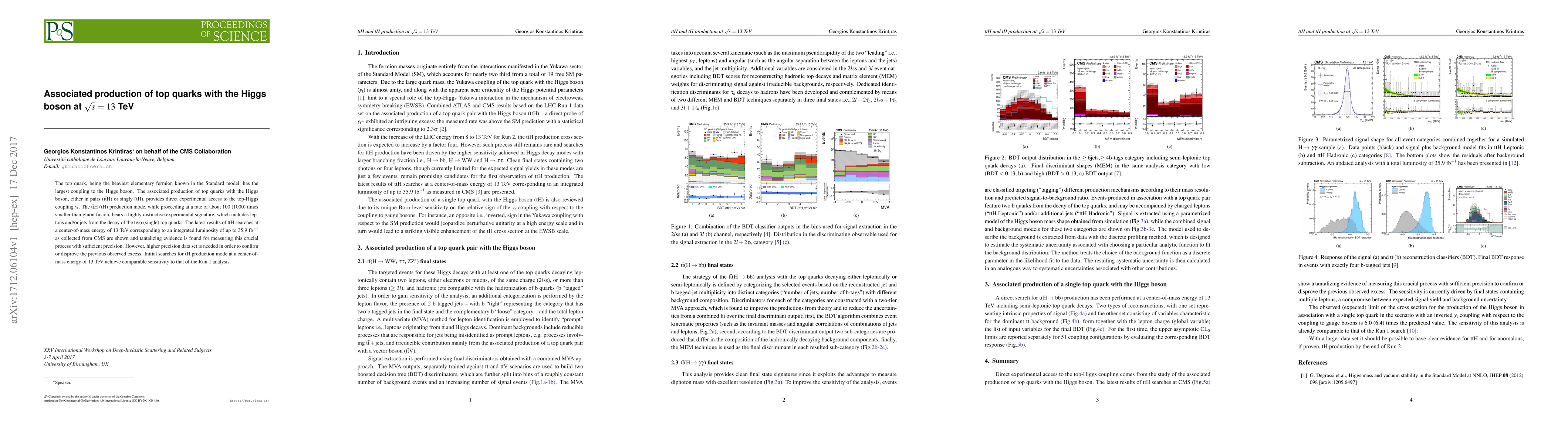The top quark, being the heaviest elementary fermion known in the Standard model, has the largest coupling to the Higgs boson. The associated production of top quarks with the Higgs boson, either in pairs (t$\bar{\rm{t}}$H) or singly (tH), provides direct experimental access to the top-Higgs coupling $y_{\rm{t}}$. The t$\bar{\rm{t}}$H (tH) production mode, while proceeding at a rate of about 100 (1000) times smaller than gluon fusion, bears a highly distinctive experimental signature, which includes leptons and/or jets from the decay of the two (single) top quarks. The latest results of ttH searches at a center-of-mass energy of 13 TeV corresponding to an integrated luminosity of up to $35.9\ \rm{fb}^{-1}$ as collected from CMS are shown and tantalizing evidence is found for measuring this crucial process with sufficient precision. However, higher precision data set is needed in order to confirm or disprove the previous observed excess. Initial searches for tH production mode at a center-of-mass energy of 13 TeV achieve comparable sensitivity to that of the Run 1 analysis.
