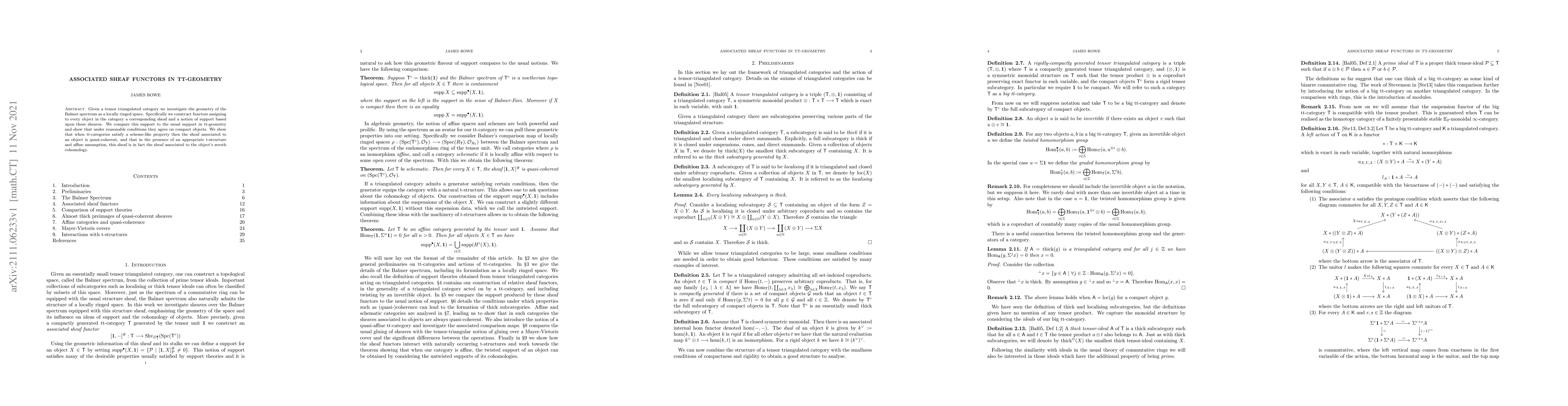 This paper constructs associated sheaf functors in tensor triangulated (tt) geometry, linking the Balmer spectrum to locally ringed spaces. It demonstrates that these sheaves' supports align with the usual tt-geometry support for compact objects, and under scheme-like properties, the sheaf becomes quasi-coherent, especially when an appropriate t-structure and affine assumption are met.