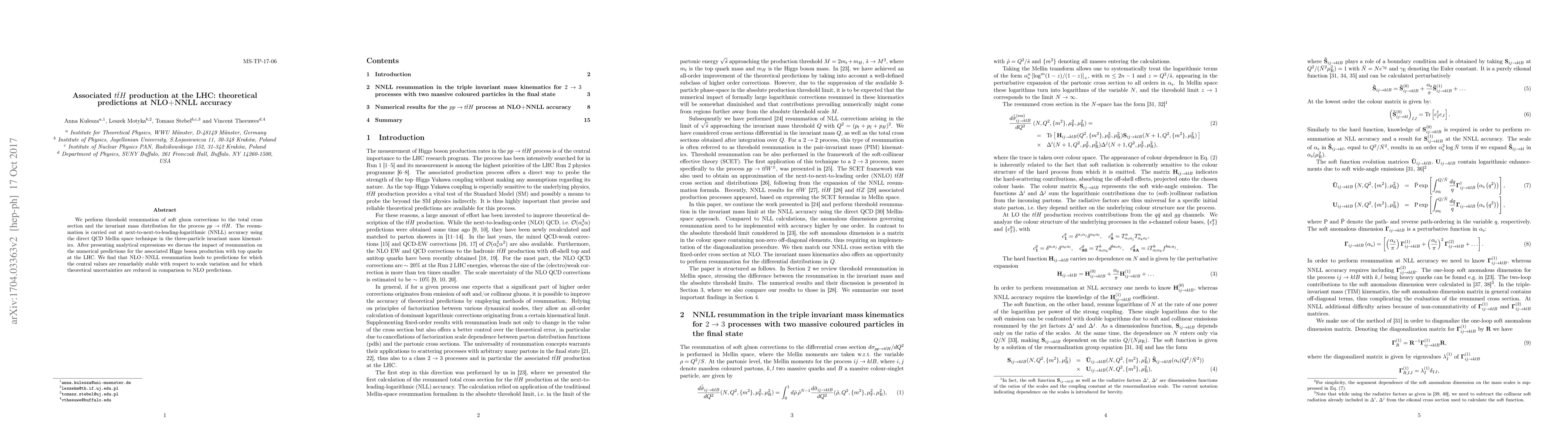 This paper presents theoretical predictions for the $t\bar{t}H$ production process at the LHC, employing next-to-next-to-leading-logarithmic (NNLL) accuracy for soft gluon resummation. The results show that NLO+NNLL resummation significantly reduces theoretical uncertainties and stabilizes central values compared to NLO predictions.