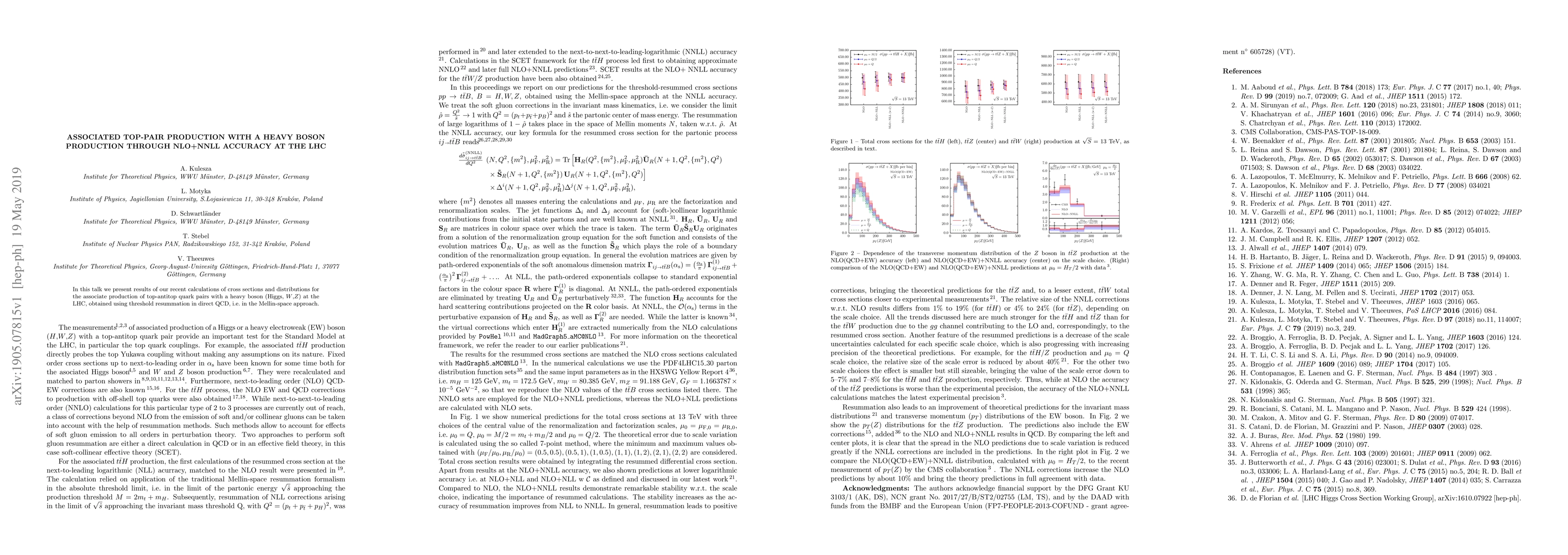 Summary: This paper presents precise calculations of cross sections and distributions for top-antitop pairs produced alongside a heavy boson (Higgs, W, Z) at the LHC, utilizing advanced threshold resummation techniques in the Mellin-space approach to achieve NLO+NNLL accuracy.