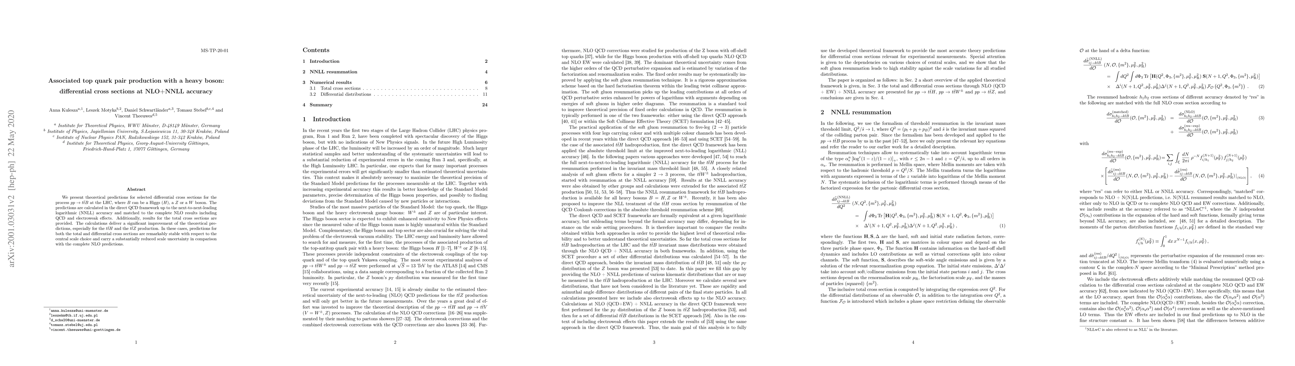 This paper presents refined theoretical predictions for differential cross sections in top quark pair production with associated heavy bosons at the LHC, calculated up to NLO+NNLL accuracy. The results notably improve the stability and reduce uncertainties for $t \bar{t} H$ and $t \bar{t} Z$ processes compared to previous NLO predictions.