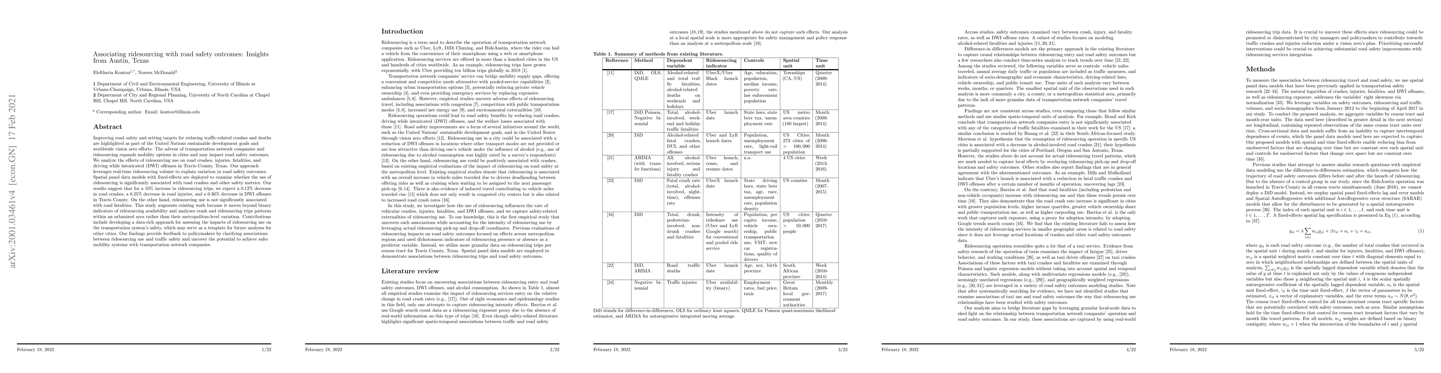 Improving road safety and setting targets for reducing traffic-related crashes and deaths are highlighted as part of the United Nation's sustainable development goals and vision zero efforts around the globe. The advent of transportation network companies, such as ridesourcing, expands mobility options in cities and may impact road safety outcomes. In this study, we analyze the effects of ridesourcing use on road crashes, injuries, fatalities, and driving while intoxicated (DWI) offenses in Travis County Texas. Our approach leverages real-time ridesourcing volume to explain variation in road safety outcomes. Spatial panel data models with fixed effects are deployed to examine whether the use of ridesourcing is significantly associated with road crashes and other safety metrics. Our results suggest that for a 10% increase in ridesourcing trips, we expect a 0.12% decrease in road crashes (p<0.05), a 0.25% decrease in road injuries (p<0.001), and a 0.36% decrease in DWI offenses (p<0.0001) in Travis County. Ridesourcing use is not associated with road fatalities at a 0.05 significance level. This study augments existing work because it moves beyond binary indicators of ridesourcing presence or absence and analyzes patterns within an urbanized area rather than metropolitan-level variation. Contributions include developing a data-rich approach for assessing the impacts of ridesourcing use on our transportation system's safety, which may serve as a template for future analyses of other US cities. Our findings provide feedback to policymakers by clarifying associations between ridesourcing use and traffic safety, while helping identify sets of actions to achieve safer and more efficient shared mobility systems.