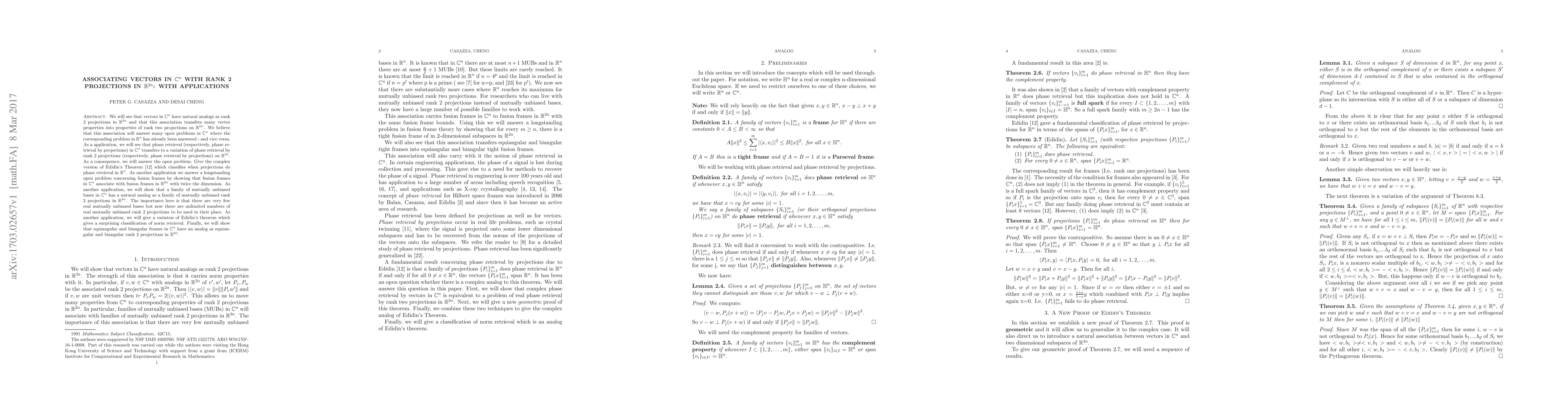 We will see that vectors in $\CC^n$ have natural analogs as rank 2 projections in $\RR^{2n}$ and that this association transfers many vector properties into properties of rank two projections on $\RR^{2n}$. We believe that this association will answer many open problems in $\CC^n$ where the corresponding problem in $\RR^n$ has already been answered - and vice versa. As a application, we will see that phase retrieval (respectively, phase retrieval by projections) in $\CC^n$ transfers to a variation of phase retrieval by rank 2 projections (respectively, phase retrieval by projections) on $\RR^{2n}$. As a consequence, we will answer the open problem: Give the complex version of Edidin's Theorem \cite{E} which classifies when projections do phase retrieval in $\RR^n$. As another application we answer a longstanding open problem concerning fusion frames by showing that fusion frames in $\CC^n$ associate with fusion frames in $\RR^{2n}$ with twice the dimension. As another application, we will show that a family of mutually unbiased bases in $\CC^n$ has a natural analog as a family of mutually unbiased rank 2 projections in $\RR^{2n}$. The importance here is that there are very few real mutually unbiased bases but now there are unlimited numbers of real mutually unbiased rank 2 projections to be used in their place. As another application, we will give a variaton of Edidin's theorem which gives a surprising classification of norm retrieval. Finally, we will show that equiangular and biangular frames in $\CC^n$ have an analog as equiangular and biangular rank 2 projections in $\RR^{2n}$.