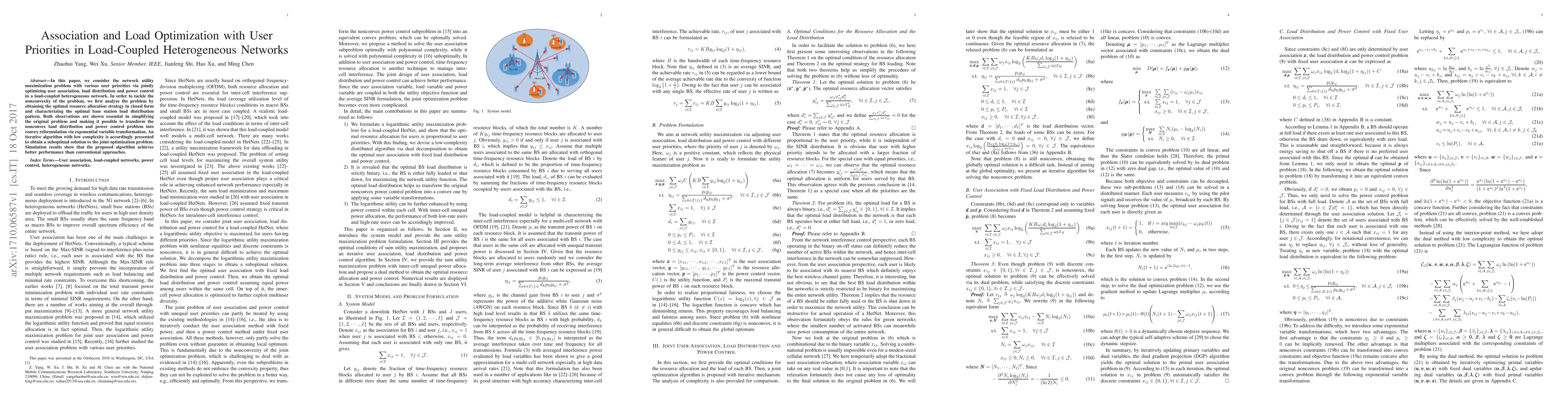 This paper proposes a method to maximize network utility in load-coupled heterogeneous networks by jointly optimizing user association, load distribution, and power control, considering various user priorities. The authors transform the nonconvex problem into a convex one via exponential variable transformation and present a low-complexity iterative algorithm to achieve a suboptimal solution, which outperforms conventional methods in simulations.