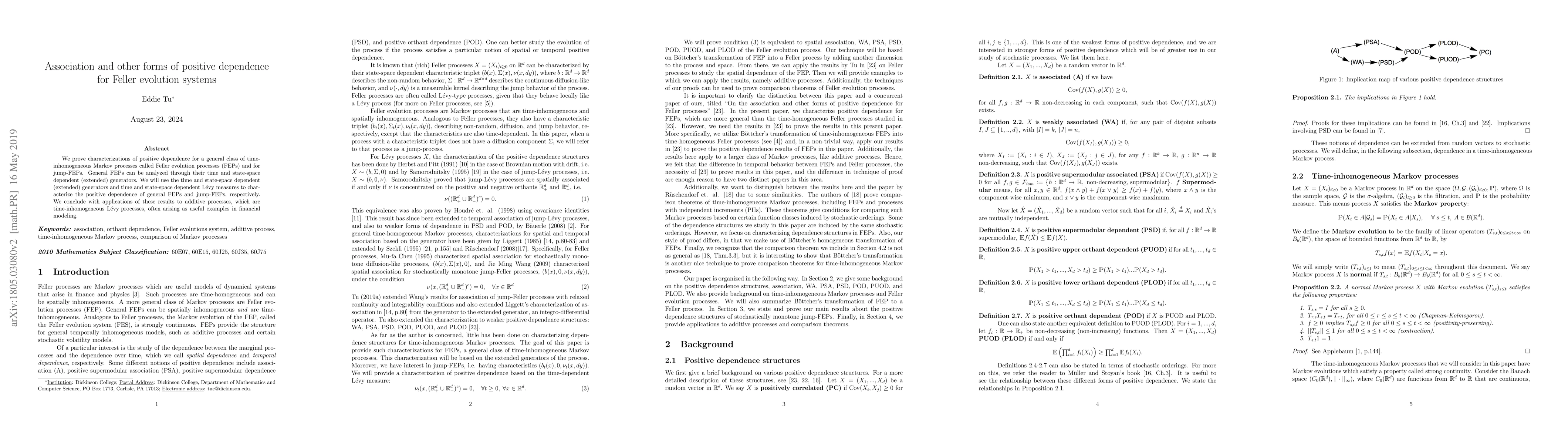 We characterize various forms of positive dependence for a general class of time-inhomogeneous Markov processes called Feller evolution processes (FEPs) and for jump-FEPs. General FEPs can be studied through their time and state-space dependent (extended) generators. We will use the time and state-space dependent (extended) generators and time and state-space dependent Levy measures to characterize the positive dependence of general FEPs and jump-FEPs, respectively. Finally, we present applications of these results to additive processes, which are time-inhomogeneous Levy processes, often arising as useful examples in financial modeling.