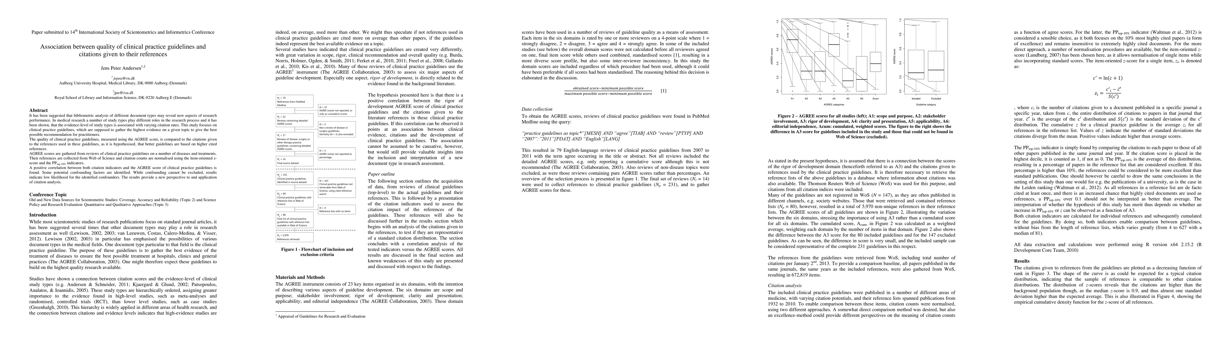 This study investigates the correlation between the quality of clinical practice guidelines, as measured by the AGREE score, and the citation rates of their references. Findings suggest a positive correlation between guideline quality and citation counts, indicating that higher quality guidelines tend to reference more cited works.