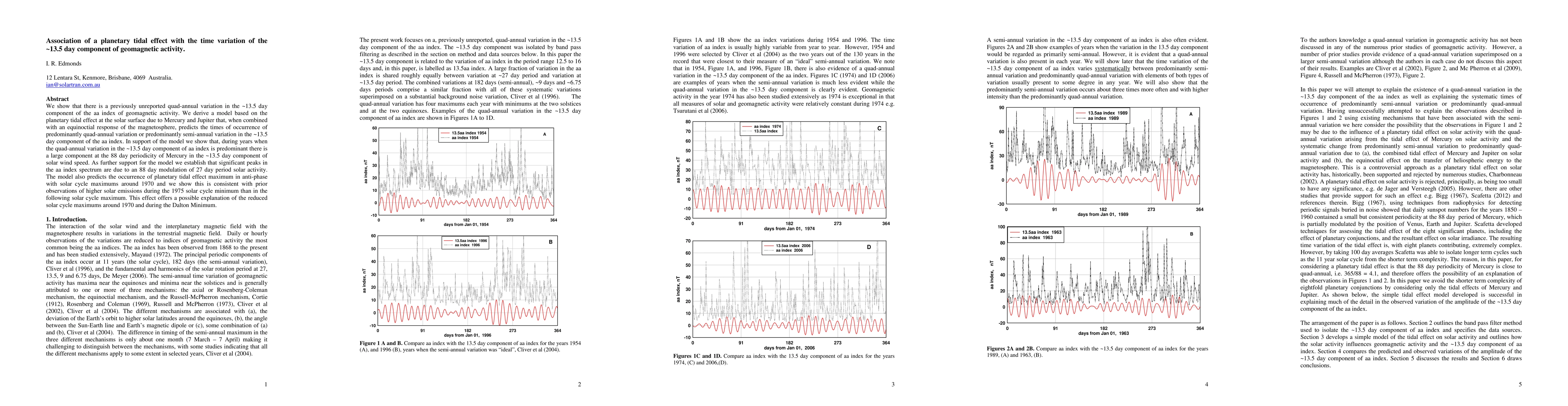 We show that there is a previously unreported quad-annual variation in the ~13.5 day component of the aa index of geomagnetic activity. We derive a model based on the planetary tidal effect at the solar surface due to Mercury and Jupiter that, when combined with an equinoctial response of the magnetosphere, predicts the times of occurrence of predominantly quad-annual variation or predominantly semi-annual variation in the ~13.5 day component of the aa index. In support of the model we show that, during years when the quad-annual variation in the ~13.5 day component of aa index is predominant there is a large component at the 88 day periodicity of Mercury in the ~13.5 day component of solar wind speed. As further support for the model we establish that significant peaks in the aa index spectrum are due to an 88 day modulation of 27 day period solar activity. The model also predicts the occurrence of planetary tidal effect maximum in anti-phase with solar cycle maximums around 1970 and we show this is consistent with prior observations of higher solar emissions during the 1975 solar cycle minimum than in the following solar cycle maximum. This effect offers a possible explanation of the reduced solar cycle maximums around 1970 and during the Dalton Minimum.