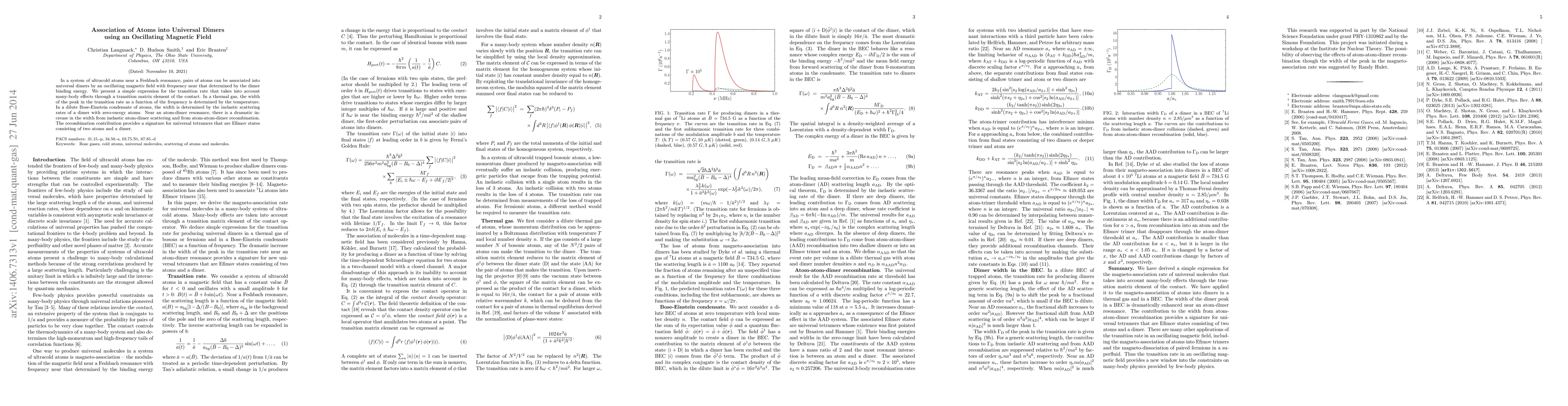This paper explores the association of ultracold atoms into universal dimers via an oscillating magnetic field near a Feshbach resonance, presenting a transition rate expression that considers many-body effects. It also investigates how temperature and inelastic scattering rates influence the peak width in different atomic systems, highlighting the signature of Efimov states in atom-dimer recombination.