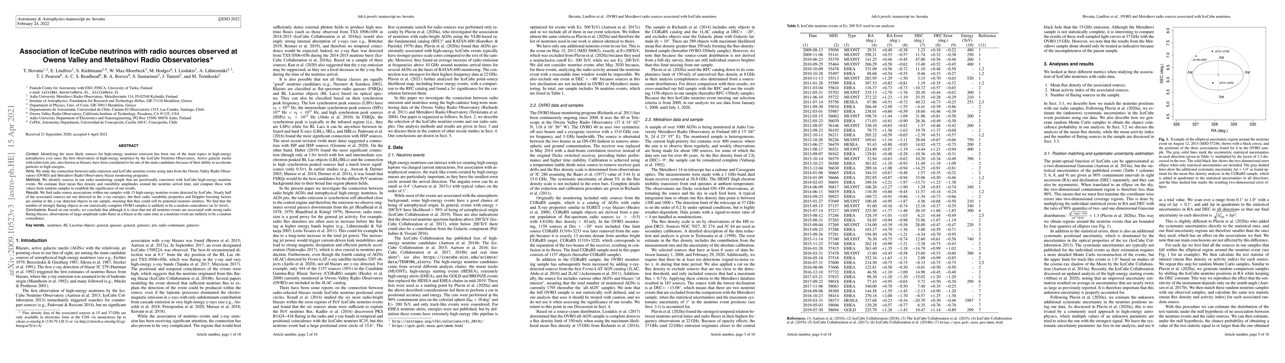 This study investigates the correlation between high-energy neutrinos detected by IceCube and radio emissions from blazars monitored by the Owens Valley and Mets\"ahovi Radio Observatories. The research finds significant associations between radio sources and 15 IceCube neutrino events, suggesting that large-amplitude radio flares in blazars may coincide with neutrino emissions, though not all neutrino events are linked to strong radio flaring blazars.