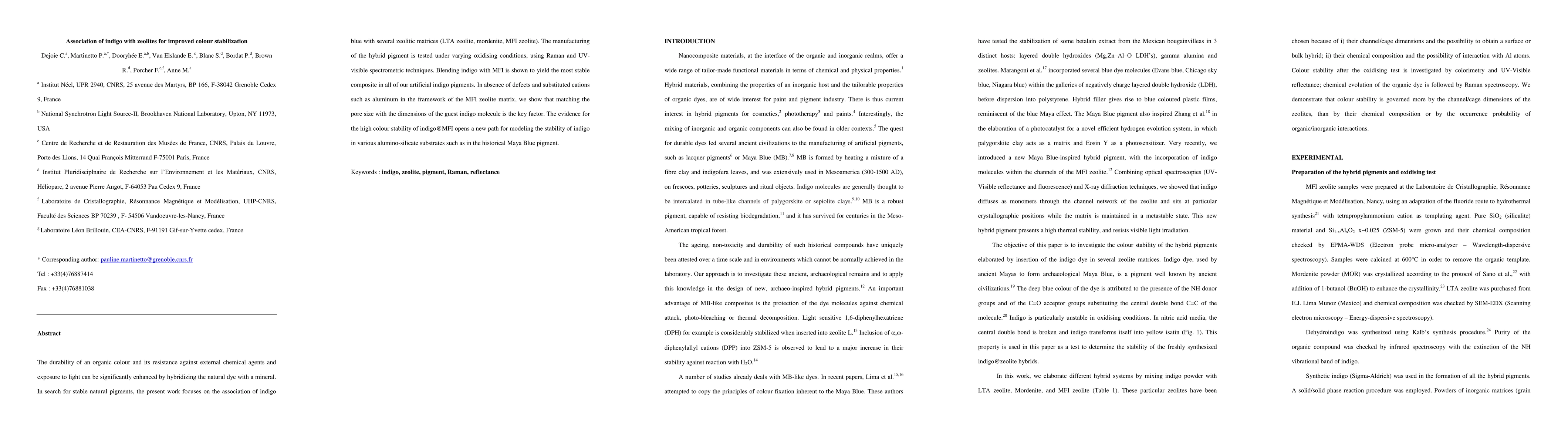 The durability of an organic colour and its resistance against external chemical agents and exposure to light can be significantly enhanced by hybridizing the natural dye with a mineral. In search for stable natural pigments, the present work focuses on the association of indigo blue with several zeolitic matrices (LTA zeolite, mordenite, MFI zeolite). The manufacturing of the hybrid pigment is tested under varying oxidising conditions, using Raman and UV-visible spectrometric techniques. Blending indigo with MFI is shown to yield the most stable composite in all of our artificial indigo pigments. In absence of defects and substituted cations such as aluminum in the framework of the MFI zeolite matrix, we show that matching the pore size with the dimensions of the guest indigo molecule is the key factor. The evidence for the high colour stability of indigo@MFI opens a new path for modeling the stability of indigo in various alumino-silicate substrates such as in the historical Maya Blue pigment.
