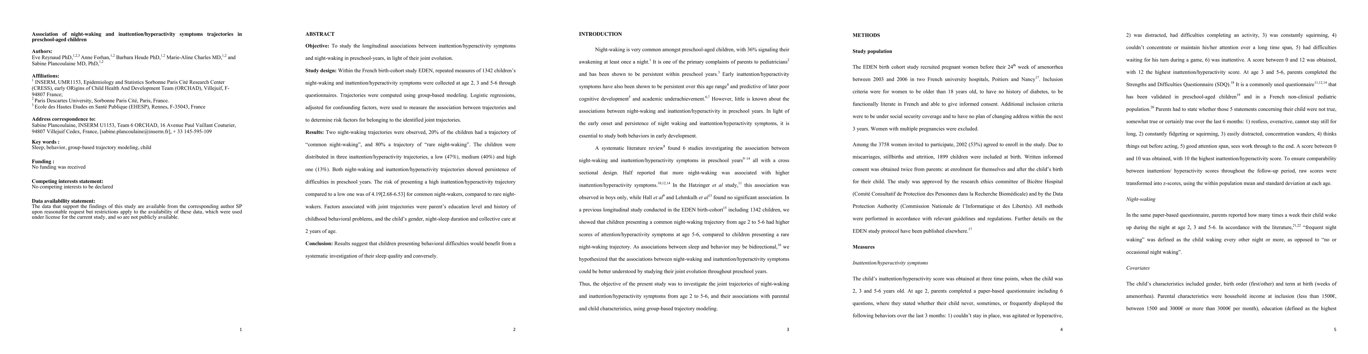 Objective: To study the longitudinal associations between inattention/hyperactivity symptoms and night-waking in preschool-years, in light of their joint evolution.Study design: Within the French birth-cohort study EDEN, repeated measures of 1342 children's night-waking and inattention/hyperactivity symptoms were collected at age 2, 3 and 5-6 through questionnaires. Trajectories were computed using group-based modeling. Logistic regressions, adjusted for confounding factors, were used to measure the association between trajectories and to determine risk factors for belonging to the identified joint trajectories.Results: Two night-waking trajectories were observed, 20% of the children had a trajectory of `common night-waking', and 80% a trajectory of `rare night-waking'. The children were distributed in three inattention/hyperactivity trajectories, a low (47%), medium (40%) and high one (13%). Both night-waking and inattention/hyperactivity trajectories showed persistence of difficulties in preschool years. The risk of presenting a high inattention/hyperactivity trajectory compared to a low one was of 4.19[2.68-6.53] for common night-wakers, compared to rare night-wakers. Factors associated with joint trajectories were parent's education level and history of childhood behavioral problems, and the child's gender, night-sleep duration and collective care at 2 years of age.Conclusion: Results suggest that children presenting behavioral difficulties would benefit from a systematic investigation of their sleep quality and conversely.