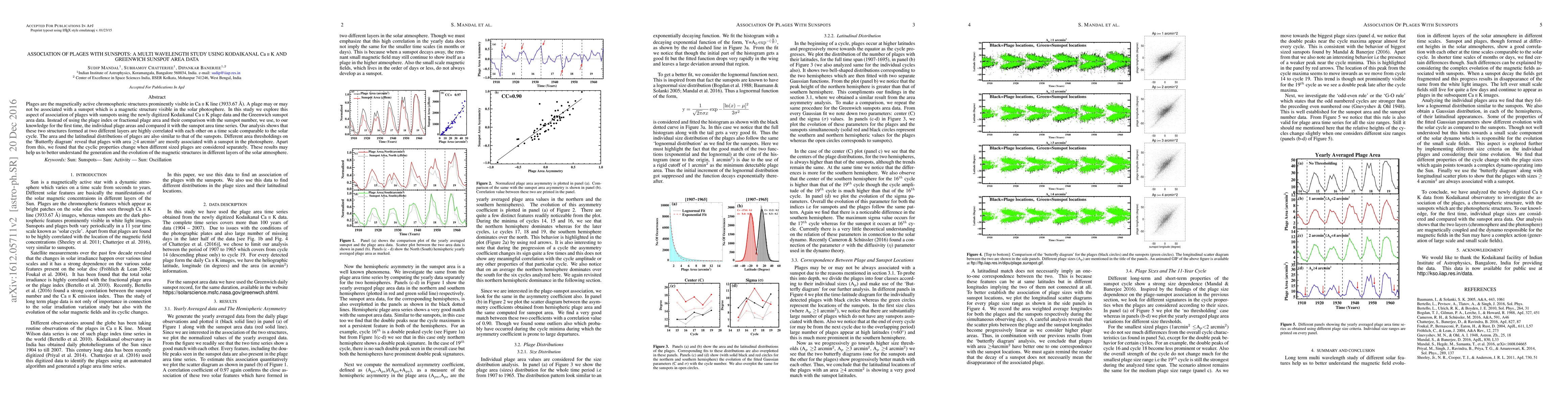 Plages are the magnetically active chromospheric structures prominently visible in Ca $\scriptsize{{\textrm{II}}}$ K line (3933.67 \r{A}). A plage may or may not be associated with a sunspot which is a magnetic structure visible in the solar photosphere. In this study we explore this aspect of association of plages with sunspots using the newly digitized Kodaikanal Ca $\scriptsize{{\textrm{II}}}$ K plage data and the Greenwich sunspot area data. Instead of using the plage index or fractional plage area and their comparison with the sunspot number, we use, to our knowledge for the first time, the individual plage areas and compared it with the sunspot area time series. Our analysis shows that these two structures formed at two different layers are highly correlated with each other on a time scale comparable to the solar cycle. The area and the latitudinal distributions of plages are also similar to that of the sunspots. Different area thresholdings on the `Butterfly diagram' reveal that plages with area $\geq$4 arcmin$^2$ are mostly associated with a sunspot in the photosphere. Apart from this, we found that the cyclic properties change when different sized plages are considered separately. These results may help us to better understand the generation and the evolution of the magnetic structures in different layers of the solar atmosphere.