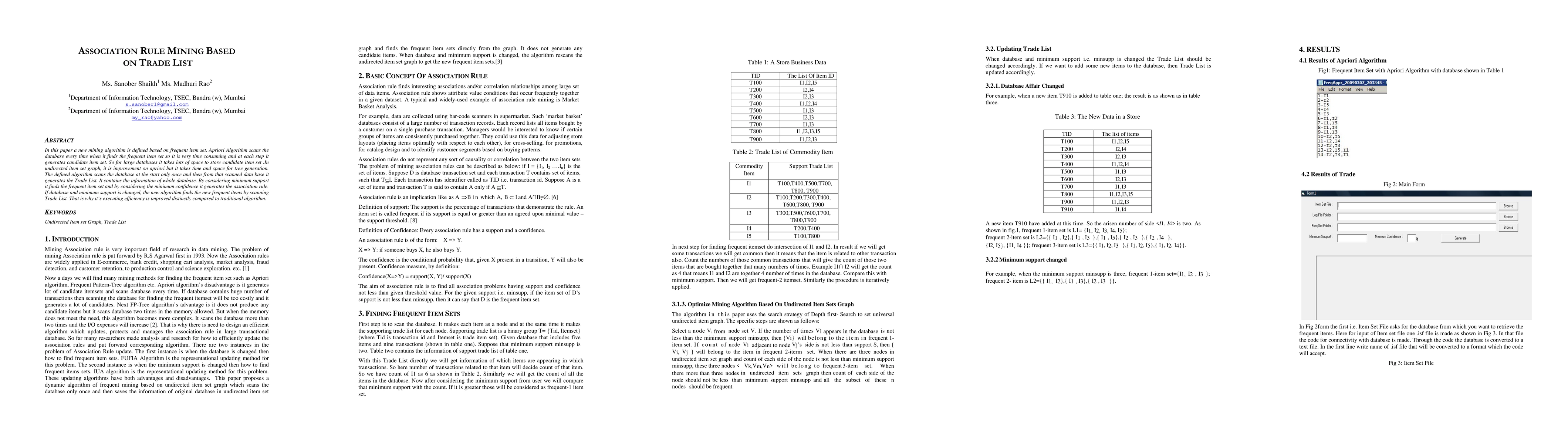 A new algorithm improves upon traditional Apriori Algorithm by scanning the database only once to generate a Trade List, reducing time and space requirements for large databases.