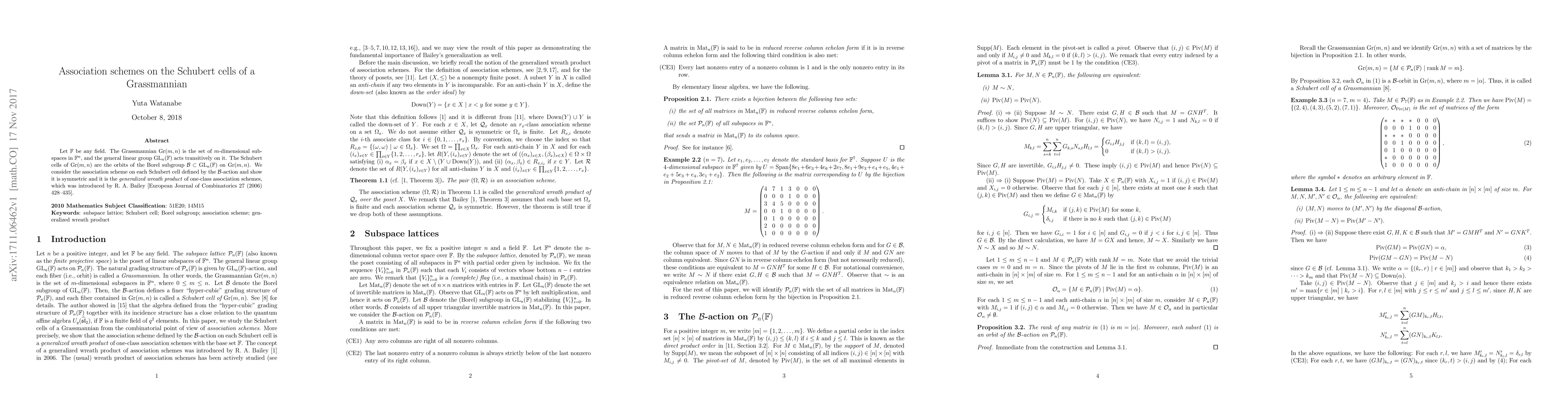 This paper explores the association schemes on the Schubert cells of a Grassmannian, demonstrating that the $\mathcal{B}$-action on each Schubert cell results in a symmetric association scheme equivalent to the generalized wreath product of one-class association schemes.