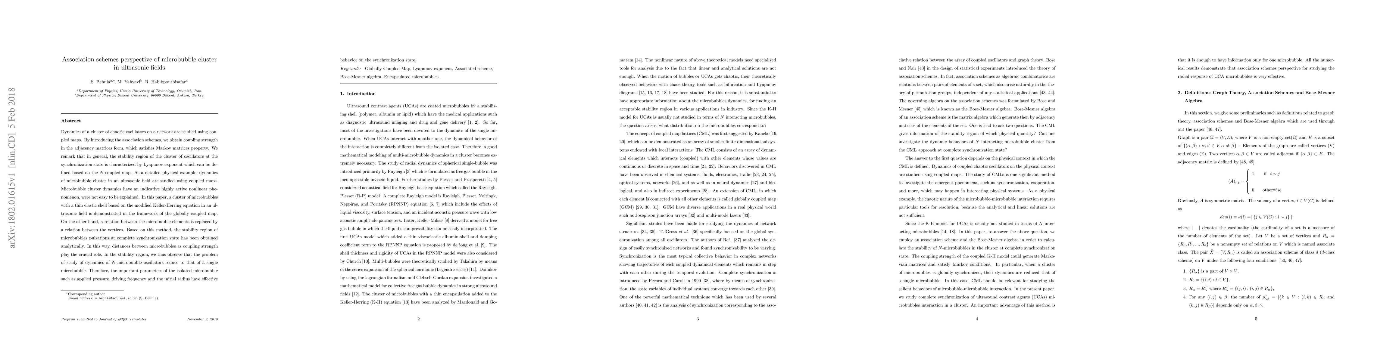 Dynamics of a cluster of chaotic oscillators on a network are studied using coupled maps. By introducing the association schemes, we obtain coupling strength in the adjacency matrices form, which satisfies Markov matrices property. We remark that in general, the stability region of the cluster of oscillators at the synchronization state is characterized by Lyapunov exponent which can be defined based on the N-coupled map. As a detailed physical example, dynamics of microbubble cluster in an ultrasonic field are studied using coupled maps. Microbubble cluster dynamics have an indicative highly active nonlinear phenomenon, were not easy to be explained. In this paper, a cluster of microbubbles with a thin elastic shell based on the modified Keller-Herring equation in an ultrasonic field is demonstrated in the framework of the globally coupled map. On the other hand, a relation between the microbubble elements is replaced by a relation between the vertices. Based on this method, the stability region of microbubbles pulsations at complete synchronization state has been obtained analytically. In this way, distances between microbubbles as coupling strength play the crucial role. In the stability region, we thus observe that the problem of the study of dynamics of N-microbubble oscillators reduce to that of a single microbubble. Therefore, the important parameters of the isolated microbubble such as applied pressure, driving frequency and the initial radius have effective behavior on the synchronization state.