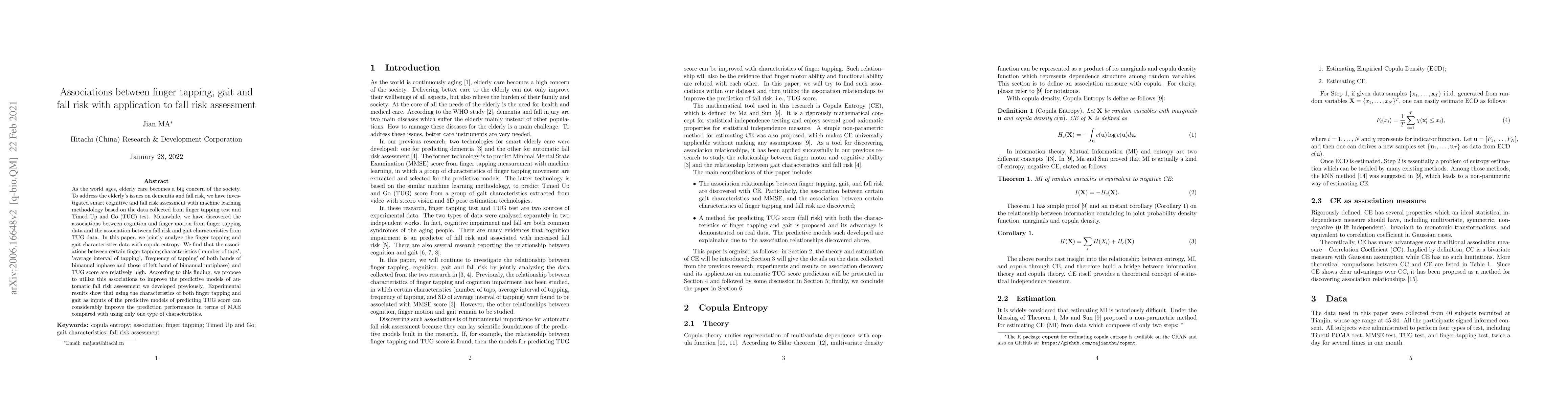 This research investigates the associations between finger tapping and gait characteristics to enhance fall risk assessment in the elderly. By analyzing data from finger tapping and Timed Up and Go tests using copula entropy, the study finds significant correlations between specific finger tapping metrics and gait performance, which improve predictive models for fall risk assessment.