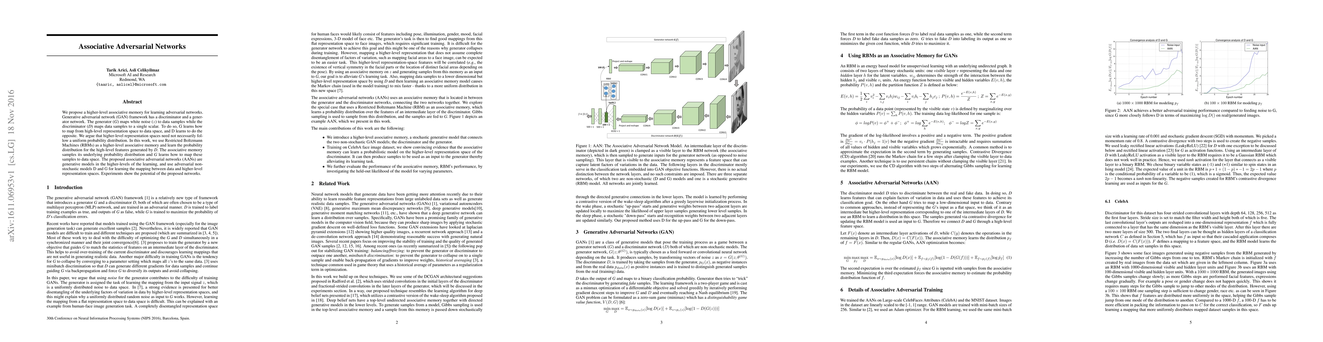 This paper introduces associative adversarial networks (AANs) that utilize Restricted Boltzmann Machines (RBMs) as higher-level associative memories to learn the probability distribution of high-level features. The proposed model employs adversarial networks to map these high-level features to data space, demonstrating potential through experiments.