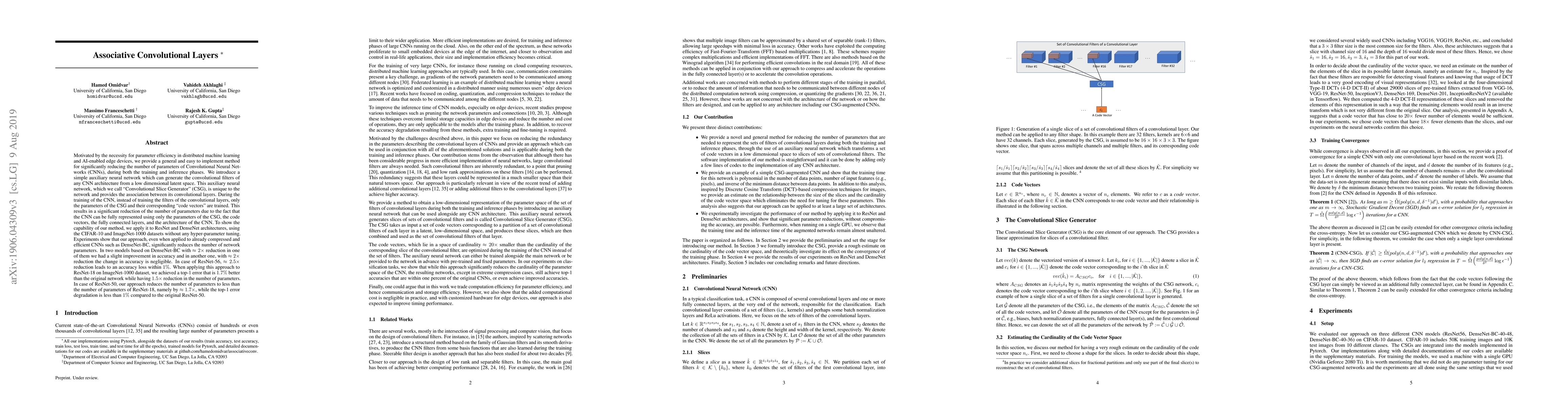 Motivated by the necessity for parameter efficiency in distributed machine learning and AI-enabled edge devices, we provide a general and easy to implement method for significantly reducing the number of parameters of Convolutional Neural Networks (CNNs), during both the training and inference phases. We introduce a simple auxiliary neural network which can generate the convolutional filters of any CNN architecture from a low dimensional latent space. This auxiliary neural network, which we call "Convolutional Slice Generator" (CSG), is unique to the network and provides the association between its convolutional layers. During the training of the CNN, instead of training the filters of the convolutional layers, only the parameters of the CSG and their corresponding "code vectors" are trained. This results in a significant reduction of the number of parameters due to the fact that the CNN can be fully represented using only the parameters of the CSG, the code vectors, the fully connected layers, and the architecture of the CNN. We evaluate our approach by applying it to ResNet and DenseNet models when trained on CIFAR-10 and ImageNet datasets. While reducing the number of parameters by $\approx 2 \times$ on average, the accuracies of these networks remain within 1$\%$ of their original counterparts and in some cases there is an increase in the accuracy.
