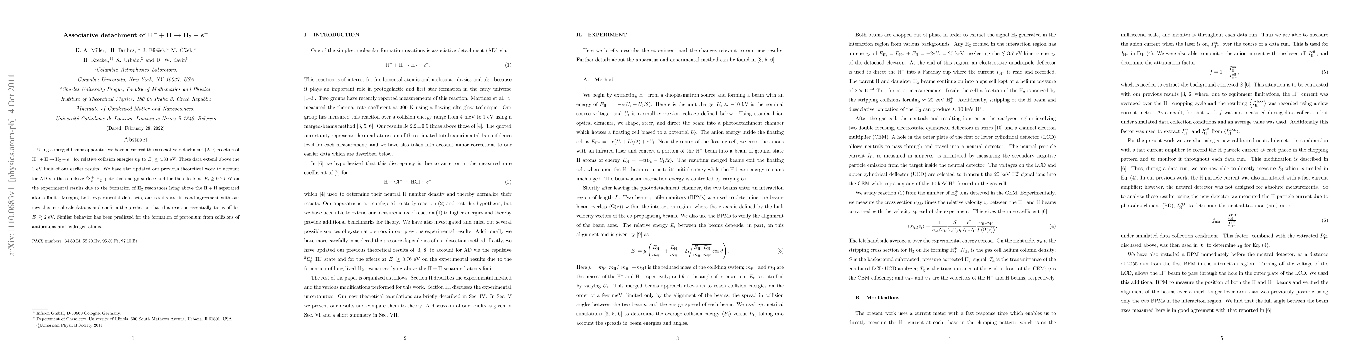 This study measures the associative detachment reaction of H$^{-}$ + H $\rightarrow$ H$_{2}$ + e$^{-}$ using a merged beams apparatus, extending previous results to higher energies. The findings, combined with updated theoretical models, confirm that the reaction diminishes for collision energies above 2 eV.