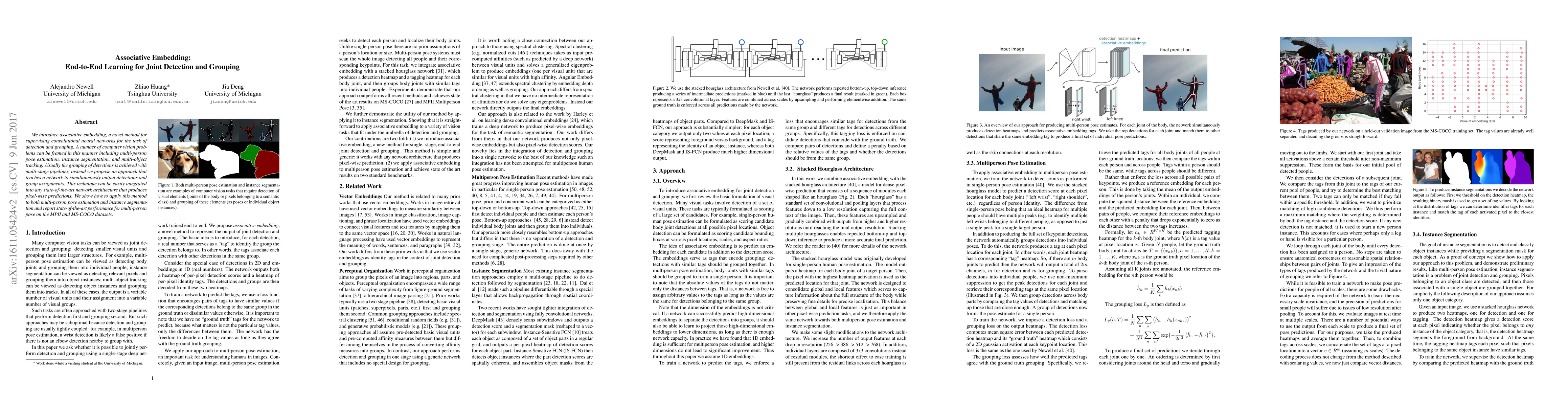 The paper introduces associative embedding, a method to jointly learn detection and grouping in convolutional neural networks, applicable to tasks like multi-person pose estimation and instance segmentation. It achieves state-of-the-art results for multi-person pose estimation on MPII and MS-COCO datasets by integrating the technique into existing network architectures.
