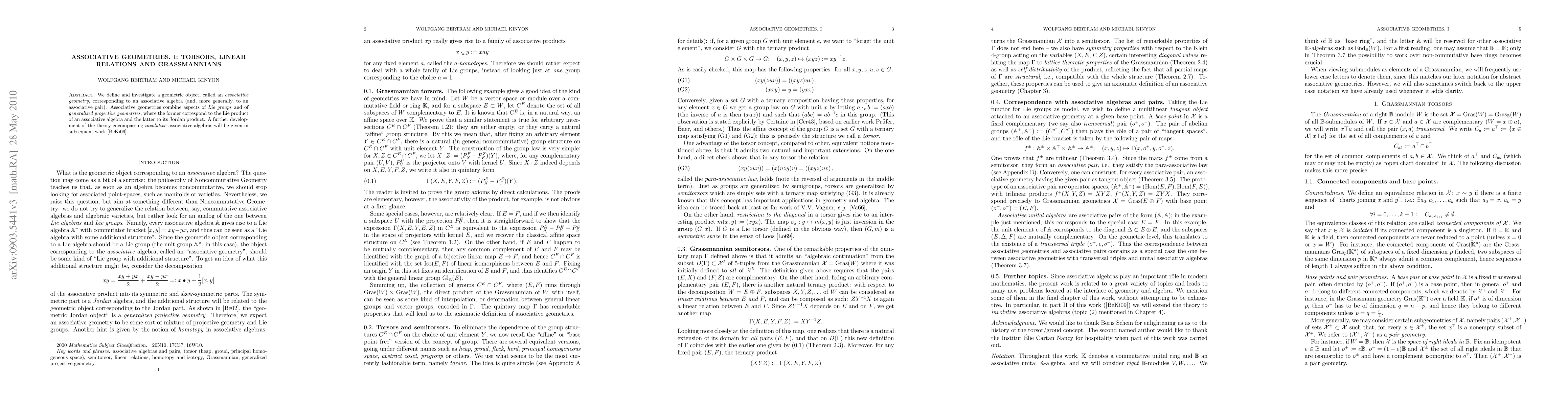 This paper introduces associative geometries, a novel geometric object linked to associative algebras, merging features of Lie groups and generalized projective geometries. Future work will extend the theory to involutive associative algebras.
