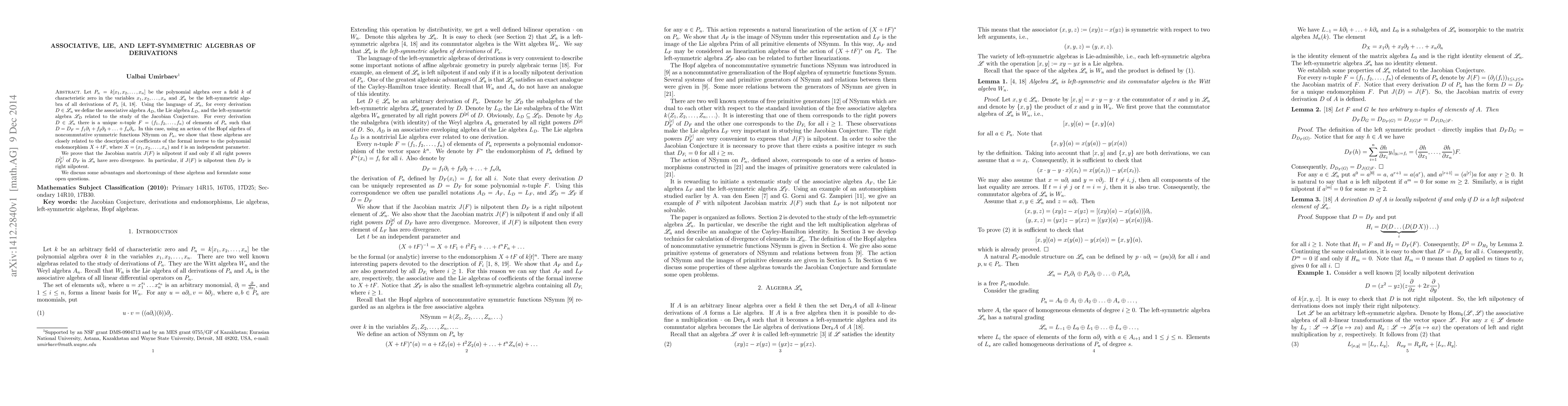 Let $P_n=k[x_1,x_2,\ldots,x_n]$ be the polynomial algebra over a field $k$ of characteristic zero in the variables $x_1,x_2,\ldots,x_n$ and $\mathscr{L}_n$ be the left-symmetric algebra of all derivations of $P_n$ \cite{Dzhuma99,UU2014-1}. Using the language of $\mathscr{L}_n$, for every derivation $D\in \mathscr{L}_n$ we define the associative algebra $A_D$, the Lie algebra $L_D$, and the left-symmetric algebra $\mathscr{L}_D$ related to the study of the Jacobian Conjecture. For every derivation $D\in \mathscr{L}_n$ there is a unique $n$-tuple $F=(f_1,f_2,\ldots,f_n)$ of elements of $P_n$ such that $D=D_F=f_1\partial_1+f_2\partial_2+\ldots+f_n\partial_n$. In this case, using an action of the Hopf algebra of noncommutative symmetric functions $\mathrm{NSymm}$ on $P_n$, we show that these algebras are closely related to the description of coefficients of the formal inverse to the polynomial endomorphism $X+tF$, where $X=(x_1,x_2,\ldots,x_n)$ and $t$ is an independent parameter. We prove that the Jacobian matrix $J(F)$ is nilpotent if and only if all right powers $D_F^{[r]}$ of $D_F$ in $\mathscr{L}_n$ have zero divergence. In particular, if $J(F)$ is nilpotent then $D_F$ is right nilpotent. We discuss some advantages and shortcomings of these algebras and formulate some open questions.