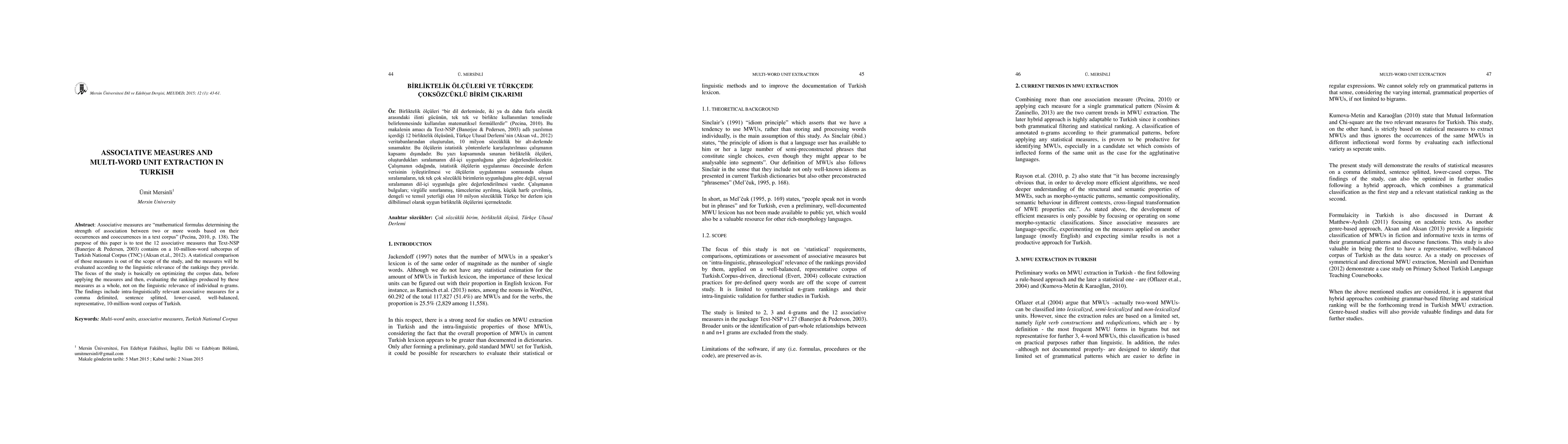 This study tests 12 associative measures from Text-NSP on a 10-million-word Turkish corpus, focusing on optimizing corpus data and evaluating overall rankings for linguistic relevance. Key findings include identifying intra-linguistically relevant associative measures for Turkish.