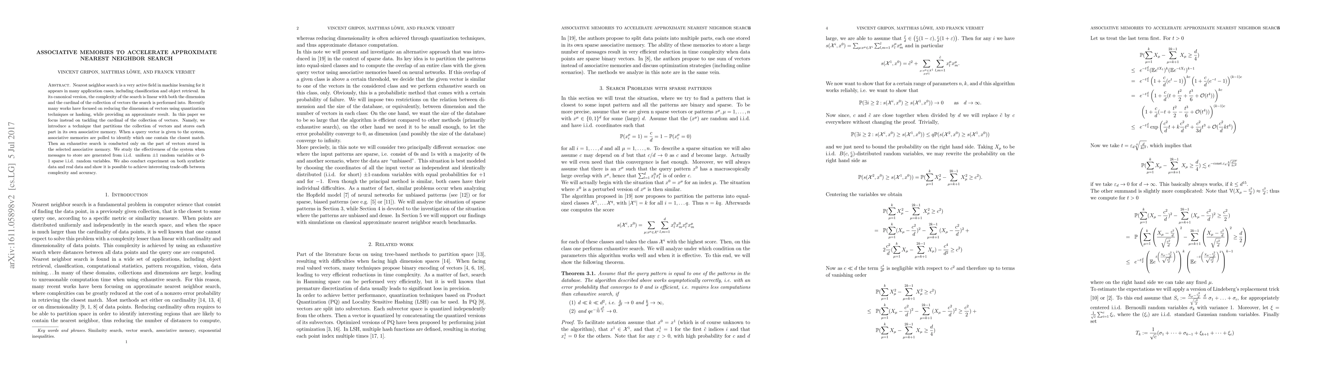 Nearest neighbor search is a very active field in machine learning for it appears in many application cases, including classification and object retrieval. In its canonical version, the complexity of the search is linear with both the dimension and the cardinal of the collection of vectors the search is performed in. Recently many works have focused on reducing the dimension of vectors using quantization techniques or hashing, while providing an approximate result. In this paper we focus instead on tackling the cardinal of the collection of vectors. Namely, we introduce a technique that partitions the collection of vectors and stores each part in its own associative memory. When a query vector is given to the system, associative memories are polled to identify which one contain the closest match. Then an exhaustive search is conducted only on the part of vectors stored in the selected associative memory. We study the effectiveness of the system when messages to store are generated from i.i.d. uniform $\pm$1 random variables or 0-1 sparse i.i.d. random variables. We also conduct experiment on both synthetic data and real data and show it is possible to achieve interesting trade-offs between complexity and accuracy.