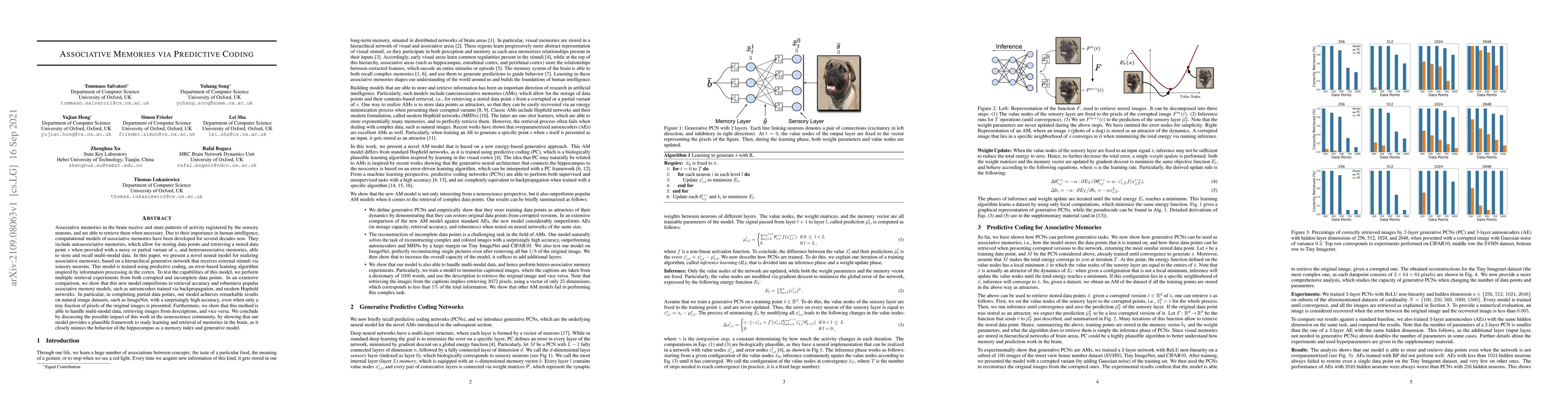 This paper introduces a novel neural model for associative memories based on a hierarchical generative network trained via predictive coding, demonstrating superior retrieval accuracy and robustness compared to traditional models like autoencoders and Hopfield networks. The model excels in completing partial data points, especially on natural image datasets, and can handle multi-modal data retrieval.