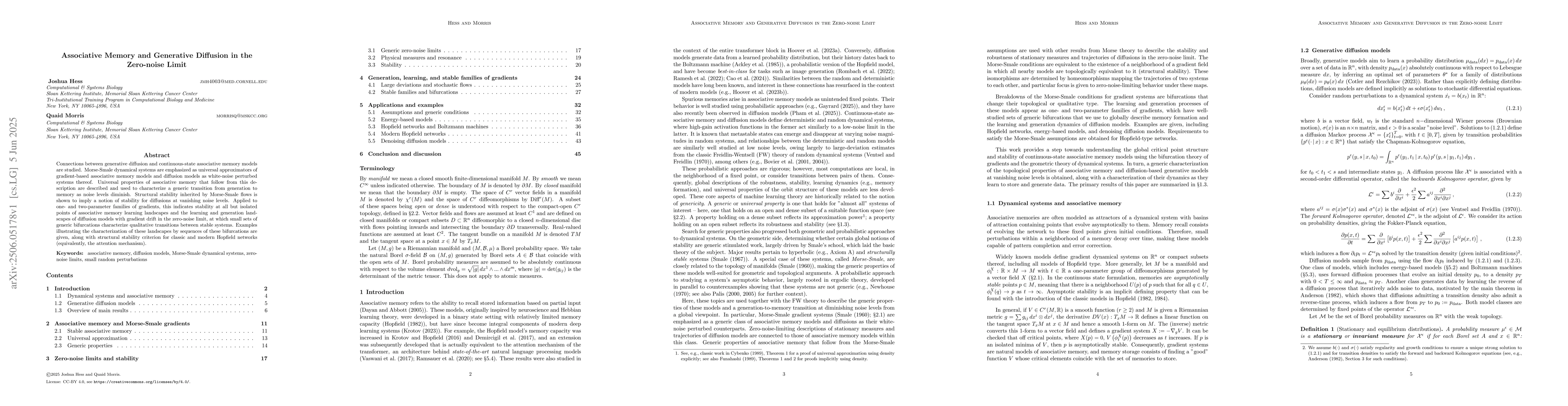 Connections between generative diffusion and continuous-state associative memory models are studied. Morse-Smale dynamical systems are emphasized as universal approximators of gradient-based associative memory models and diffusion models as white-noise perturbed systems thereof. Universal properties of associative memory that follow from this description are described and used to characterize a generic transition from generation to memory as noise levels diminish. Structural stability inherited by Morse-Smale flows is shown to imply a notion of stability for diffusions at vanishing noise levels. Applied to one- and two-parameter families of gradients, this indicates stability at all but isolated points of associative memory learning landscapes and the learning and generation landscapes of diffusion models with gradient drift in the zero-noise limit, at which small sets of generic bifurcations characterize qualitative transitions between stable systems. Examples illustrating the characterization of these landscapes by sequences of these bifurcations are given, along with structural stability criterion for classic and modern Hopfield networks (equivalently, the attention mechanism).