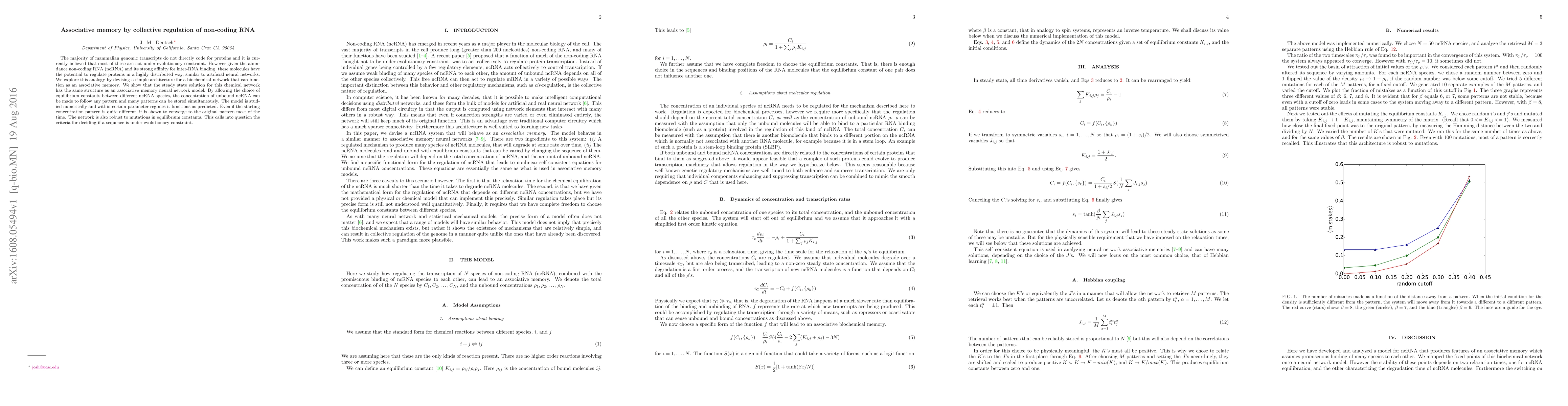 The majority of mammalian genomic transcripts do not directly code for proteins and it is currently believed that most of these are not under evolutionary constraint. However given the abundance non-coding RNA (ncRNA) and its strong affinity for inter-RNA binding, these molecules have the potential to regulate proteins in a highly distributed way, similar to artificial neural networks. We explore this analogy by devising a simple architecture for a biochemical network that can function as an associative memory. We show that the steady state solution for this chemical network has the same structure as an associative memory neural network model. By allowing the choice of equilibrium constants between different ncRNA species, the concentration of unbound ncRNA can be made to follow any pattern and many patterns can be stored simultaneously. The model is studied numerically and within certain parameter regimes it functions as predicted. Even if the starting concentration pattern is quite different, it is shown to converge to the original pattern most of the time. The network is also robust to mutations in equilibrium constants. This calls into question the criteria for deciding if a sequence is under evolutionary constraint.