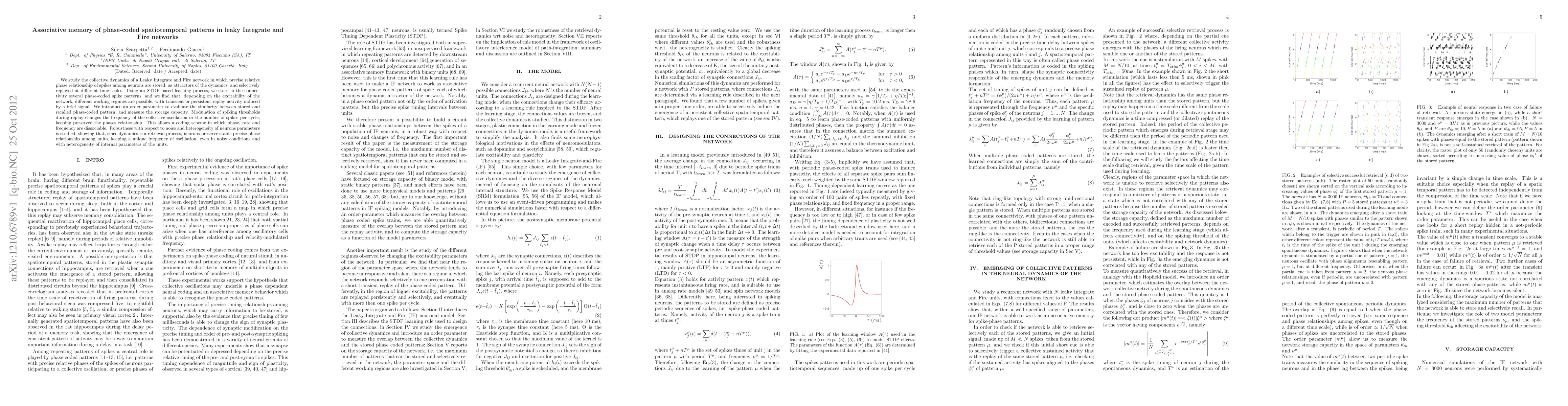 This study explores how a Leaky Integrate and Fire network can store and replay phase-coded spatiotemporal spike patterns using STDP-based learning, revealing different working regimes and a robust retrieval process that maintains precise phase relationships despite noise and neuron parameter heterogeneity. The network demonstrates a dissociable coding scheme for phase, rate, and frequency.