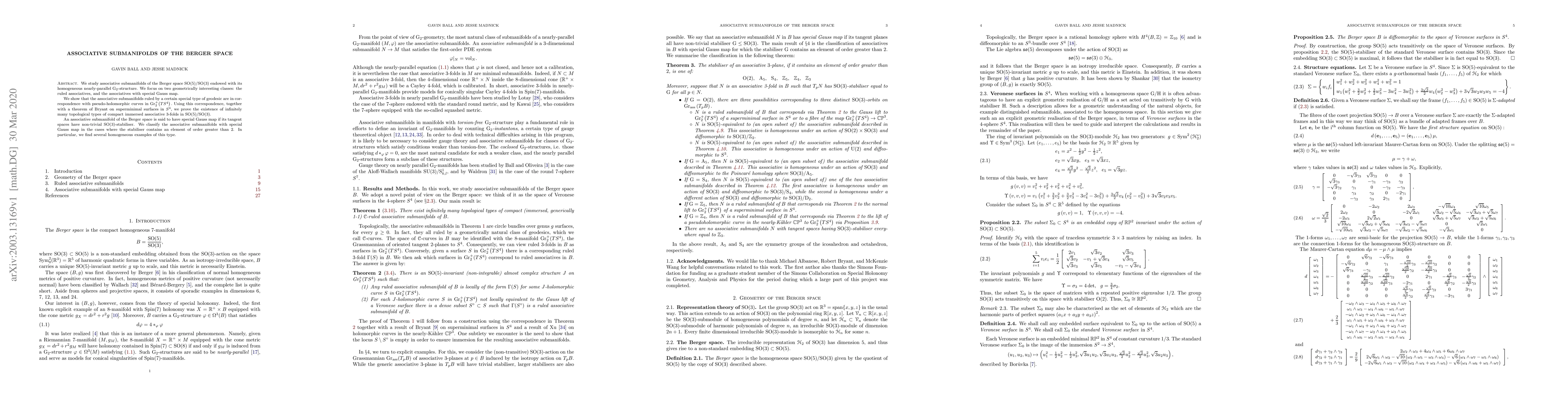 This paper investigates associative submanifolds within the Berger space SO(5)/SO(3) with a nearly-parallel G2-structure, focusing on ruled associatives and those with special Gauss maps. It establishes a correspondence between certain ruled associatives and pseudo-holomorphic curves, leading to the discovery of infinitely many compact immersed associative 3-folds. Additionally, the paper classifies associative submanifolds with special Gauss maps, particularly those with stabilizers containing elements of order greater than 2.