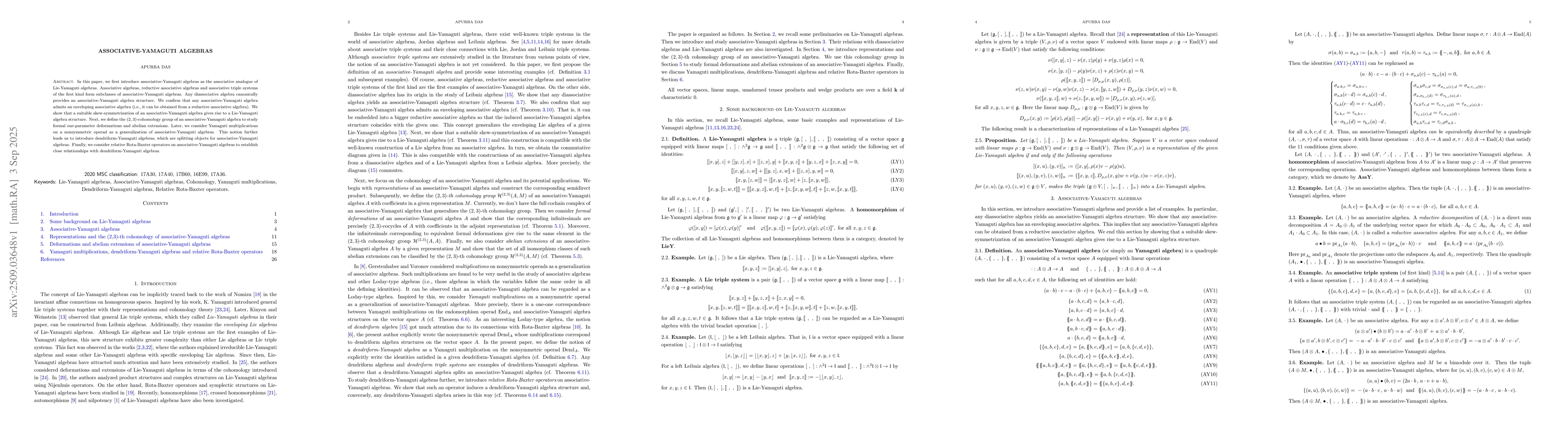 In this paper, we first introduce associative-Yamaguti algebras as the associative analogue of Lie-Yamaguti algebras. Associative algebras, reductive associative algebras and associative triple systems of the first kind form subclasses of associative-Yamaguti algebras. Any diassociative algebra canonically provides an associative-Yamaguti algebra structure. We confirm that any associative-Yamaguti algebra admits an enveloping associative algebra (i.e., it can be obtained from a reductive associative algebra). We show that a suitable skew-symmetrization of an associative-Yamaguti algebra gives rise to a Lie-Yamaguti algebra structure. Next, we define the $(2,3)$-cohomology group of an associative-Yamaguti algebra to study formal one-parameter deformations and abelian extensions. Later, we consider Yamaguti multiplications on a nonsymmetric operad as a generalization of associative-Yamaguti algebras. This notion further leads us to introduce dendriform-Yamaguti algebras, which are splitting objects for associative-Yamaguti algebras. Finally, we consider relative Rota-Baxter operators on associative-Yamaguti algebras to establish close relationships with dendriform-Yamaguti algebras.