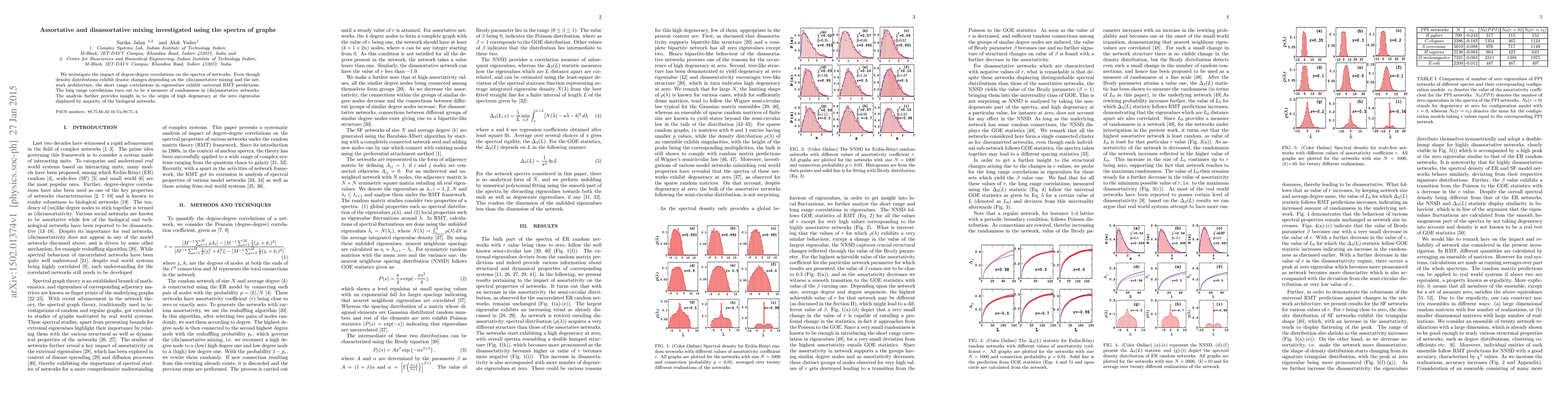 This paper examines how degree-degree correlations affect network spectra, revealing that while network density varies with assortative or disassortative mixing, the short-range correlations in eigenvalues follow universal random matrix theory predictions. Long-range correlations indicate randomness in these networks, and the study also uncovers the origin of high degeneracy at the zero eigenvalue in many biological networks.