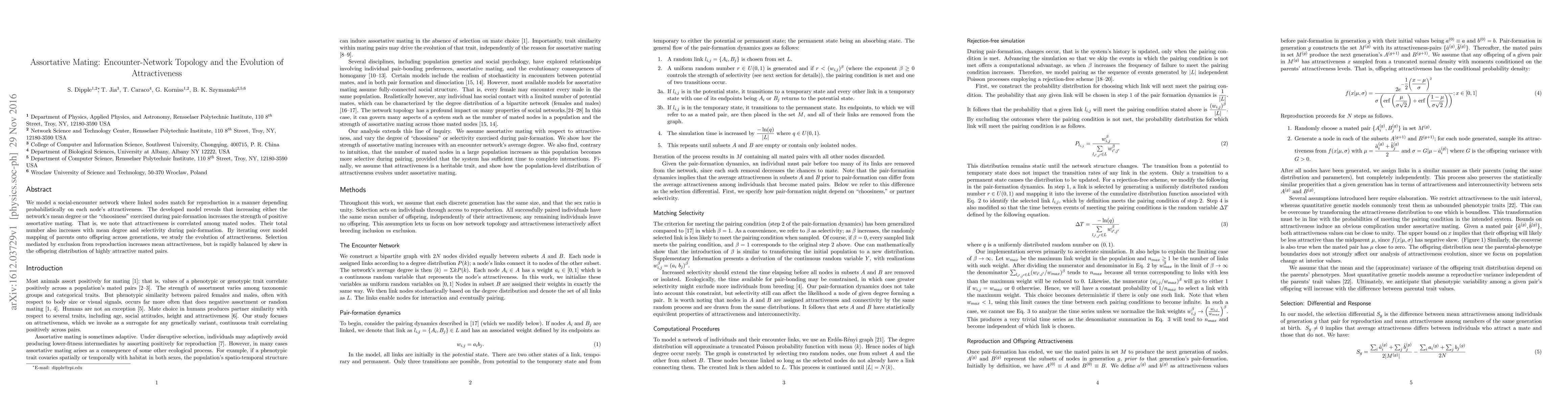 This paper models a social-encounter network to explore how network topology and choosiness during pair-formation influence assortative mating and the evolution of attractiveness. It finds that higher network connectivity and selectivity enhance positive assortative mating and increase the number of attractive pairs, but selection pressures lead to a balanced distribution of attractiveness over generations.