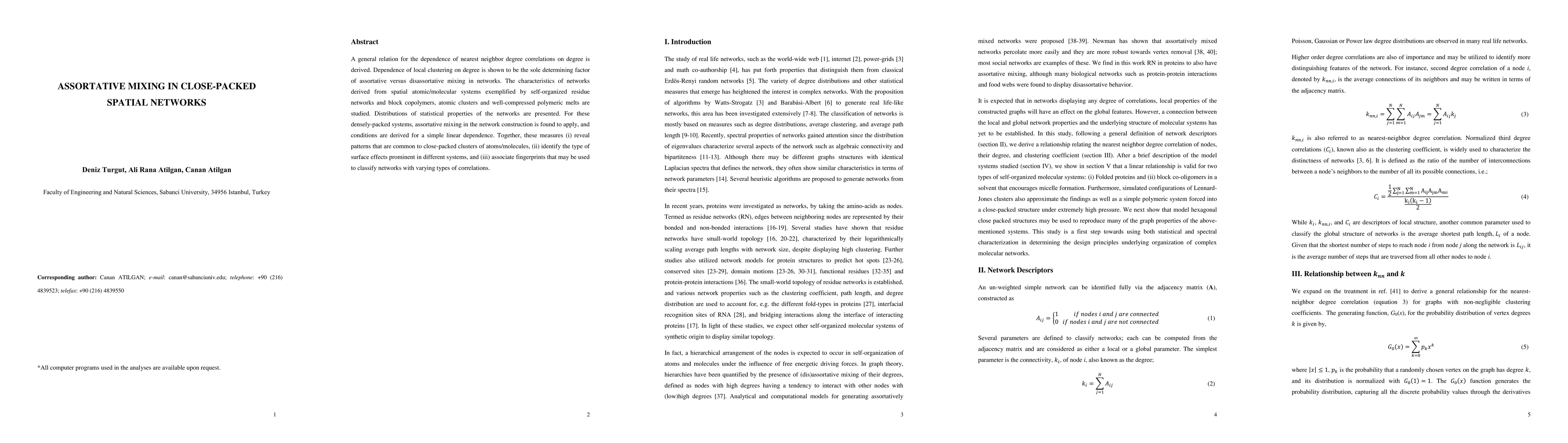 A general relation for the dependence of nearest neighbor degree correlations on degree is derived. Dependence of local clustering on degree is shown to be the sole determining factor of assortative versus disassortative mixing in networks. The characteristics of networks derived from spatial atomic/molecular systems exemplified by self-organized residue networks and block copolymers, atomic clusters and well-compressed polymeric melts are studied. Distributions of statistical properties of the networks are presented. For these densely-packed systems, assortative mixing in the network construction is found to apply, and conditions are derived for a simple linear dependence. Together, these measures (i) reveal patterns that are common to close-packed clusters of atoms/molecules, (ii) identify the type of surface effects prominent in different systems, and (iii) associate fingerprints that may be used to classify networks with varying types of correlations.