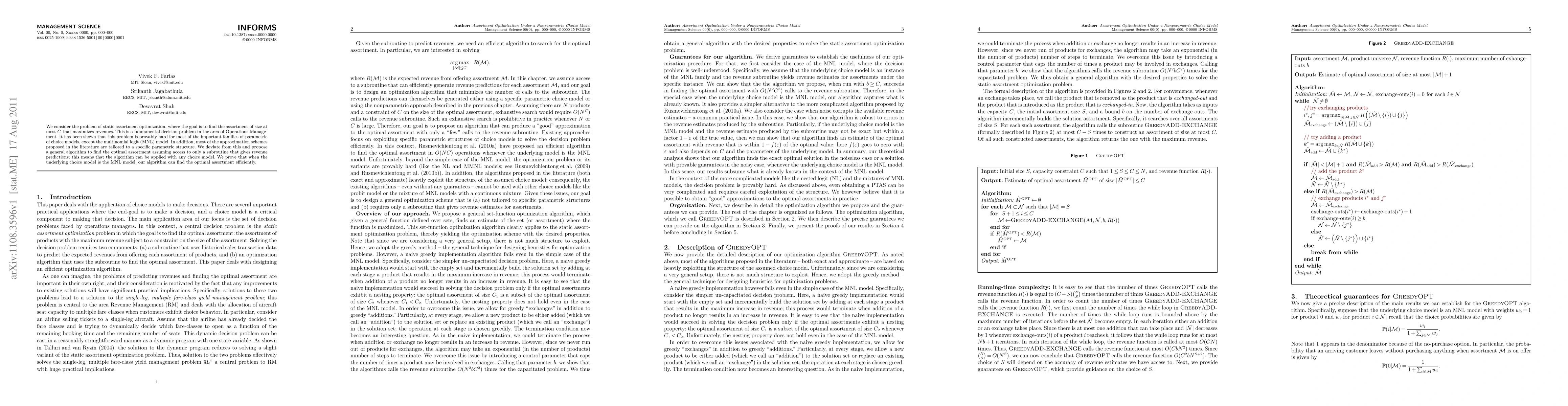 This paper proposes a general algorithm for static assortment optimization that maximizes revenue without requiring specific parametric assumptions, applicable to any choice model. When the underlying choice model is the multinomial logit (MNL) model, the algorithm efficiently finds the optimal assortment.