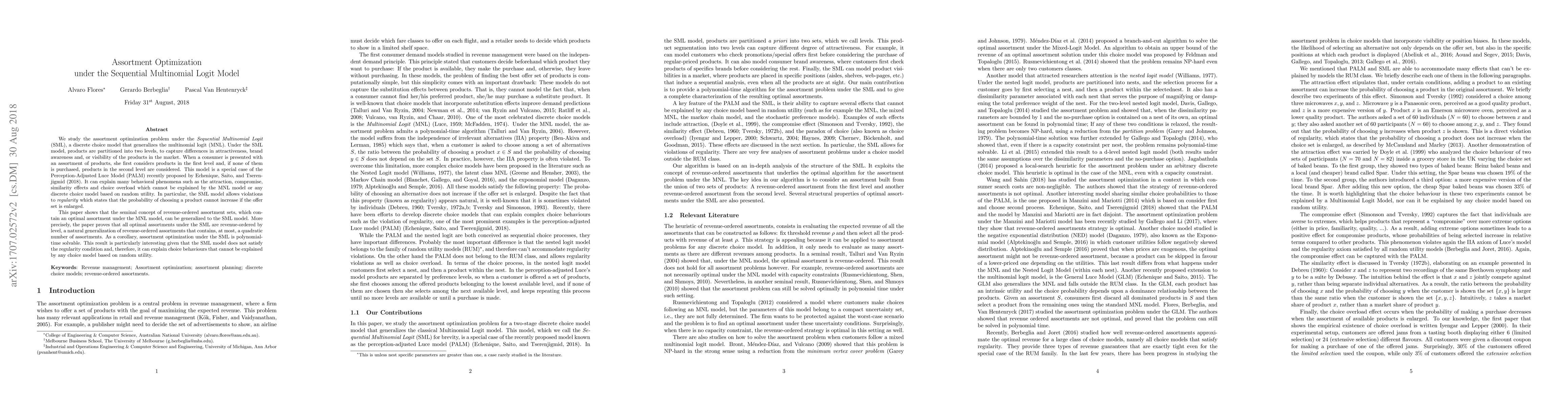 This paper explores the assortment optimization problem under the Sequential Multinomial Logit (SML) model, which generalizes the multinomial logit model by partitioning products into two levels. It proves that optimal assortments under the SML model are revenue-ordered by level, allowing for polynomial-time solvability and explaining behavioral phenomena not captured by traditional models.