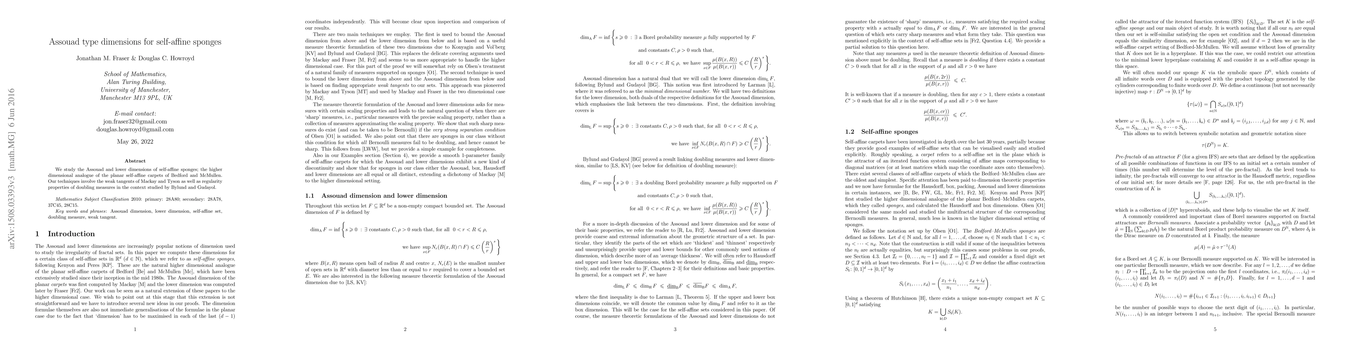 This paper investigates the Assouad and lower dimensions of self-affine sponges, higher-dimensional analogues of self-affine carpets, using Mackay and Tyson's weak tangents and Bylund and Gudayol's doubling measures to derive regularity properties.