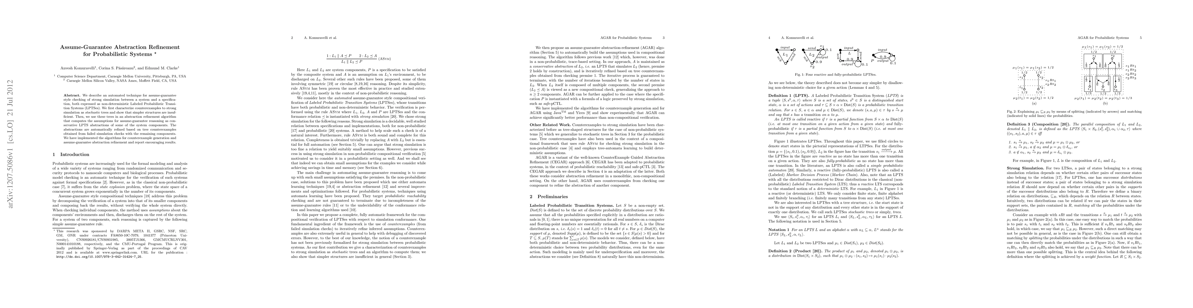 This paper presents an automated method for checking strong simulation between a system and a specification, both modeled as non-deterministic Labeled Probabilistic Transition Systems. The technique refines conservative abstractions of the system to ensure accurate assume-guarantee reasoning, using counterexamples to drive the refinement process.