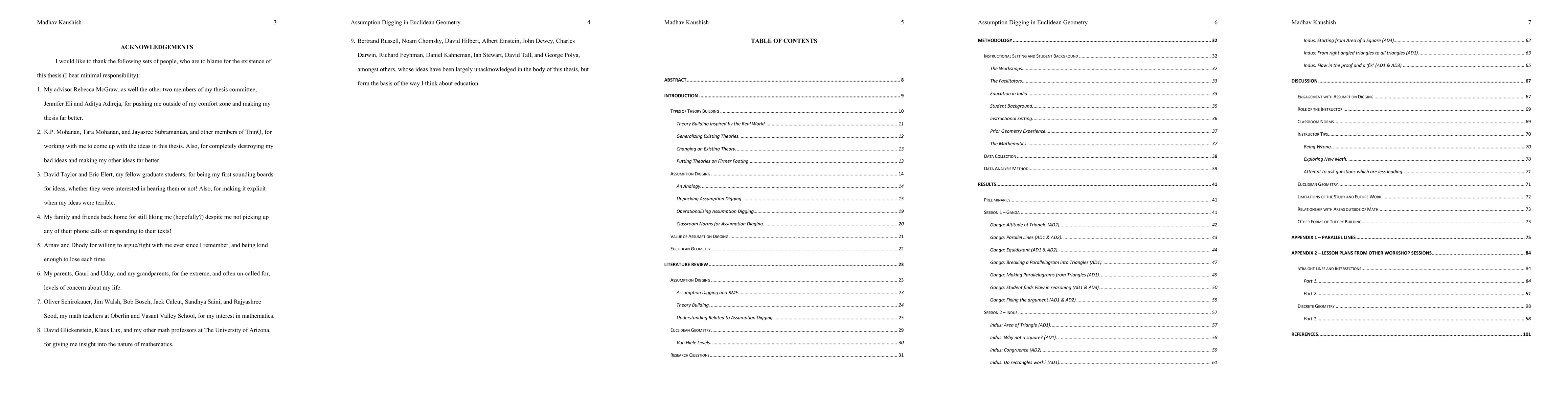 This teaching experiment involved 7th-10th grade students in two schools in Western India, focusing on Assumption Digging in Euclidean Geometry to explore theory building, a process often overlooked in mathematics education.