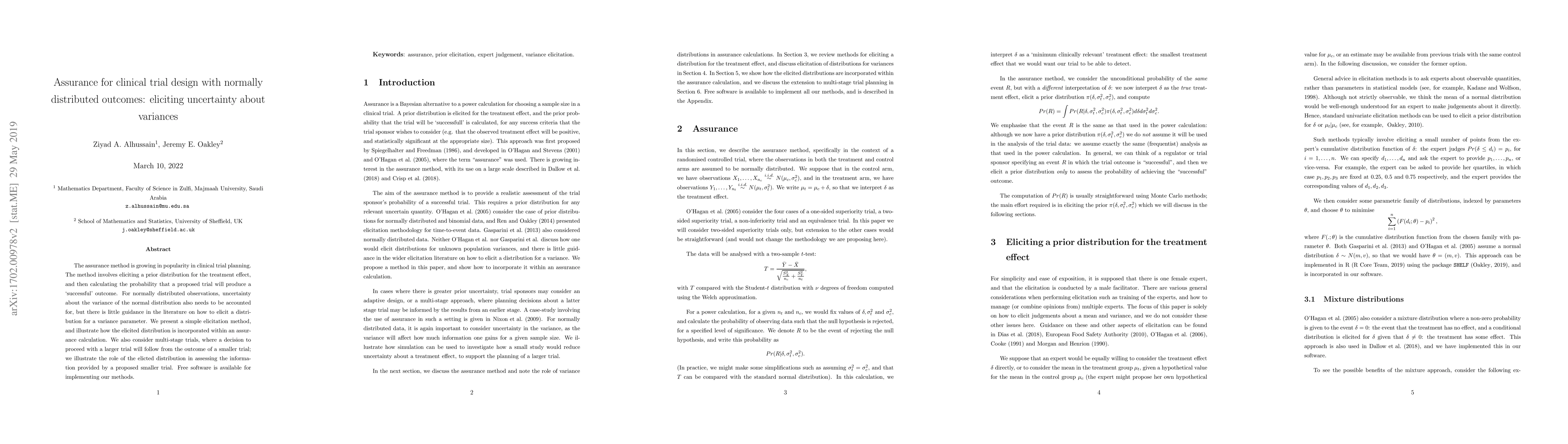 This paper introduces a method for eliciting uncertainty about variances in clinical trial designs with normally distributed outcomes, enhancing the assurance method. It provides a simple elicitation technique for variance distributions and demonstrates its application in assurance calculations, including multi-stage trials. Free software is available to implement the proposed methods.