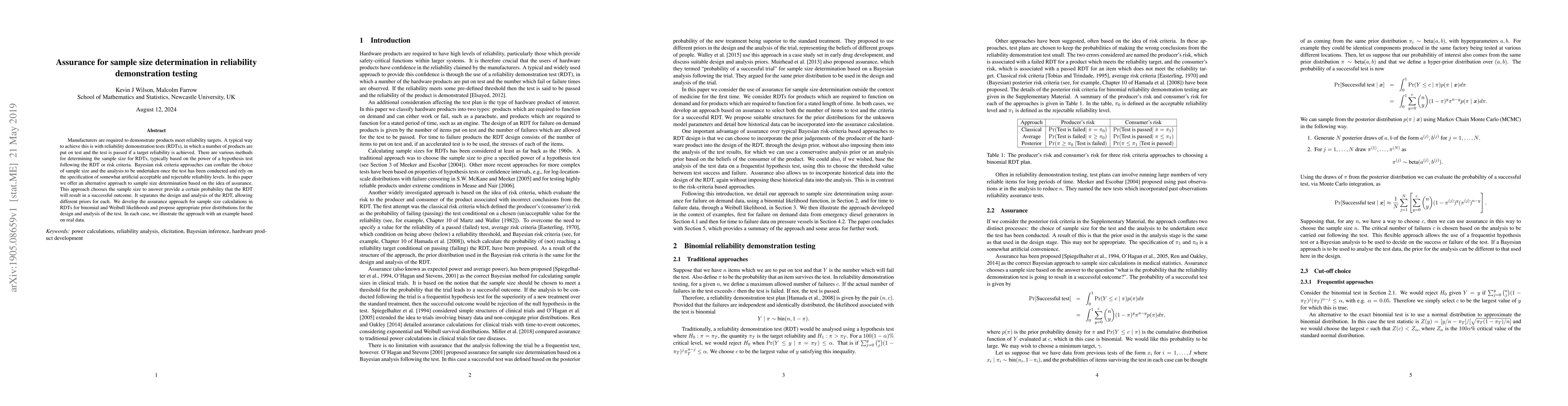 This paper proposes an assurance-based approach to determine sample size for reliability demonstration tests (RDTs), separating the design and analysis phases. It contrasts with Bayesian risk criteria by providing a certain probability of a successful RDT outcome, illustrated with examples for binomial and Weibull likelihoods.