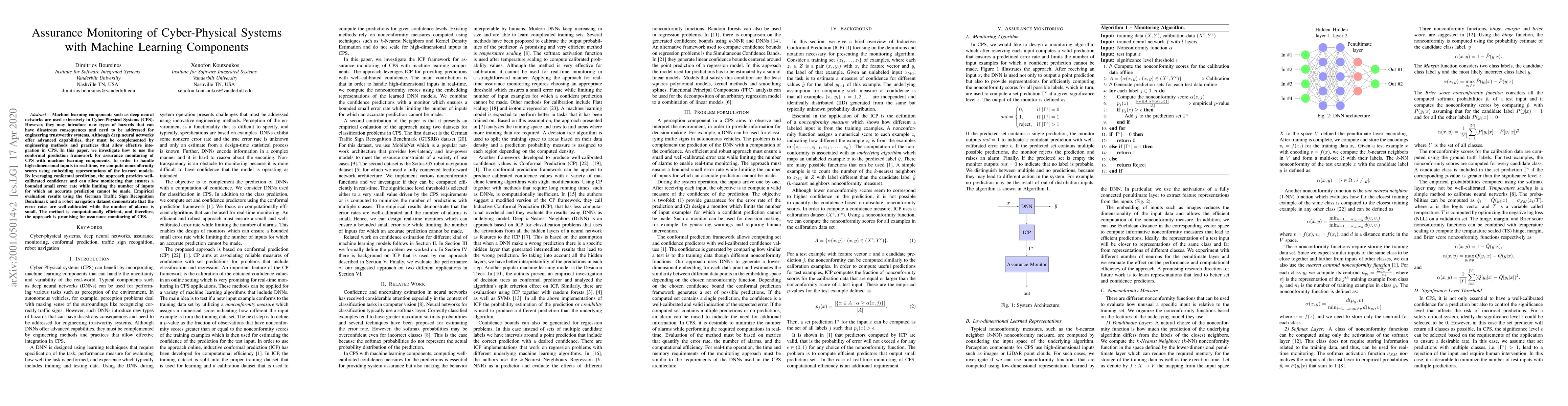 Machine learning components such as deep neural networks are used extensively in Cyber-Physical Systems (CPS). However, they may introduce new types of hazards that can have disastrous consequences and need to be addressed for engineering trustworthy systems. Although deep neural networks offer advanced capabilities, they must be complemented by engineering methods and practices that allow effective integration in CPS. In this paper, we investigate how to use the conformal prediction framework for assurance monitoring of CPS with machine learning components. In order to handle high-dimensional inputs in real-time, we compute nonconformity scores using embedding representations of the learned models. By leveraging conformal prediction, the approach provides well-calibrated confidence and can allow monitoring that ensures a bounded small error rate while limiting the number of inputs for which an accurate prediction cannot be made. Empirical evaluation results using the German Traffic Sign Recognition Benchmark and a robot navigation dataset demonstrate that the error rates are well-calibrated while the number of alarms is small. The method is computationally efficient, and therefore, the approach is promising for assurance monitoring of CPS.