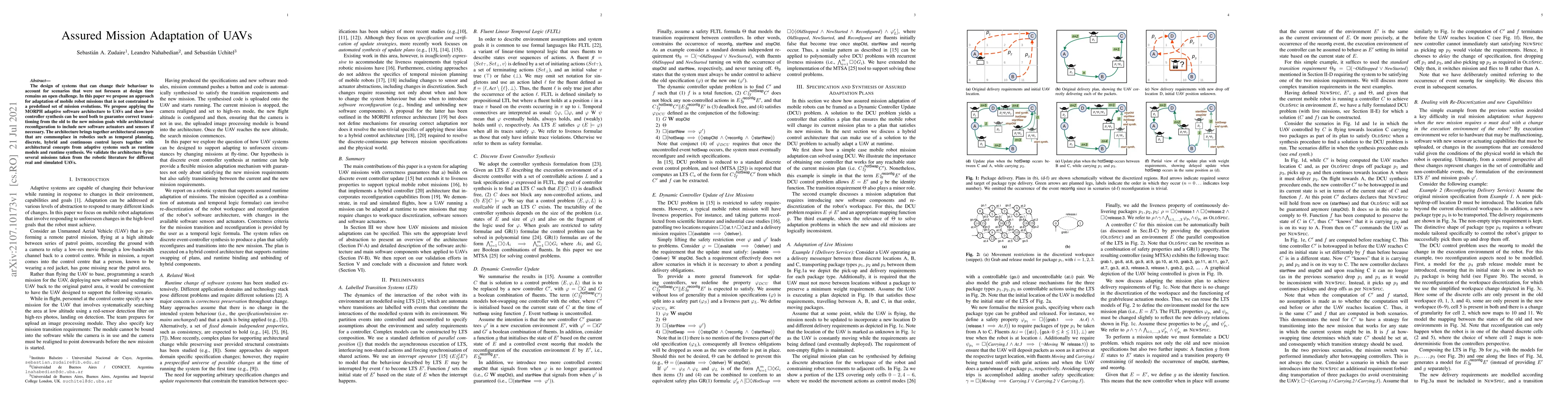 The paper proposes an adaptive software architecture, MORPH, for UAV mission adaptation, utilizing controller synthesis to ensure correct transitions between mission goals and architectural reconfigurations for new sensors and actuators.