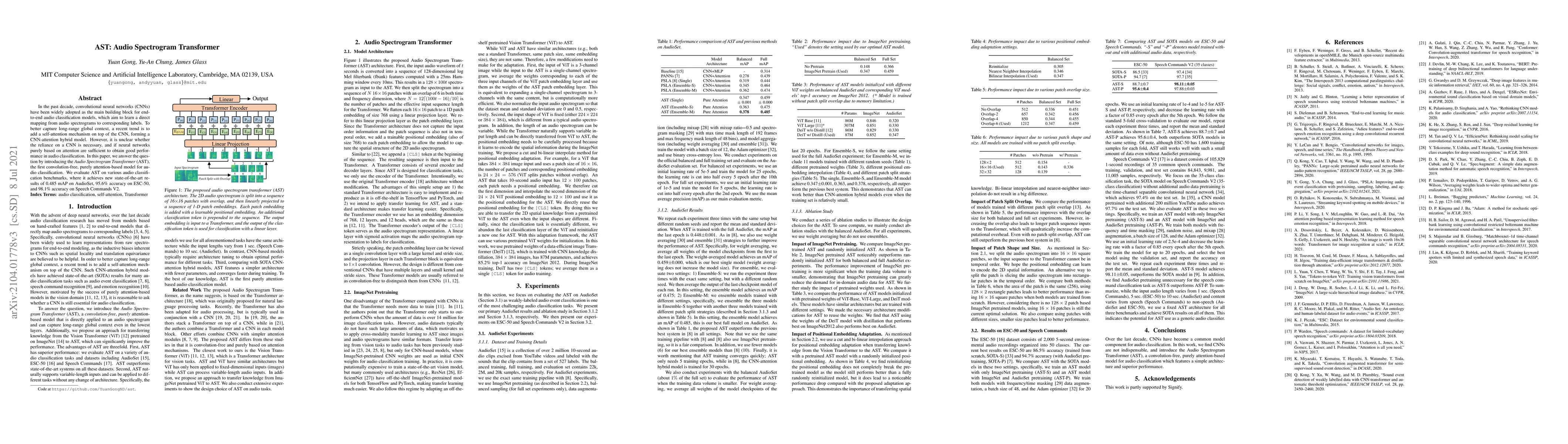 The Audio Spectrogram Transformer (AST) is a convolution-free, purely attention-based model for audio classification, achieving state-of-the-art results on multiple benchmarks, demonstrating the effectiveness of attention mechanisms in audio classification.