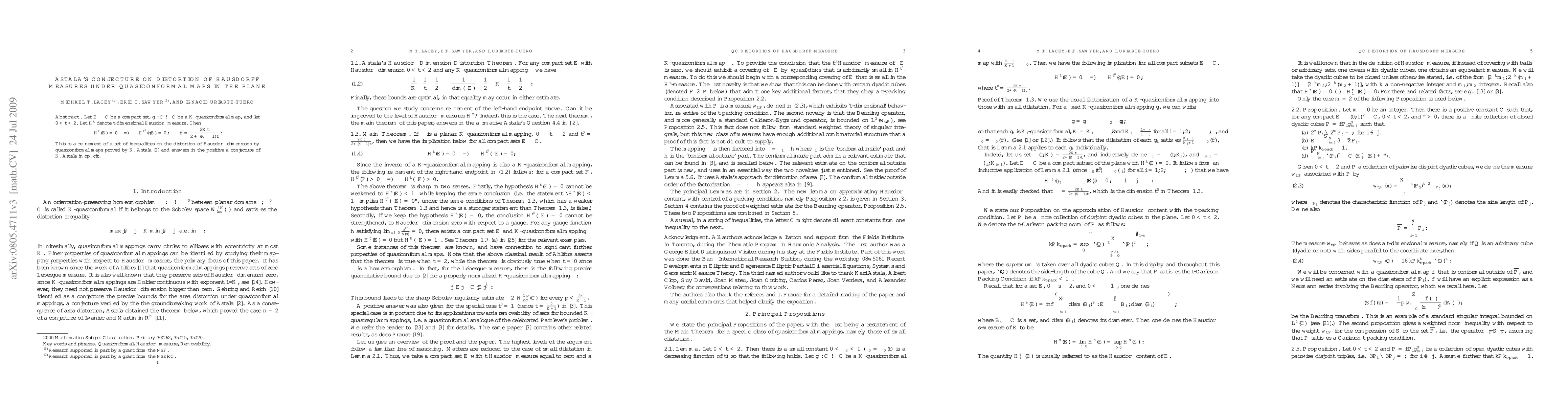 Astala's Conjecture posits that for a compact set E in the plane and a K-quasiconformal map g, if the Hausdorff measure H^t(E) is zero for 0<t<2, then H^{t'}(gE) is also zero for t'=[2Kt]/[2+(K-1)t]. This result refines previous inequalities on Hausdorff dimension distortion by quasiconformal maps and confirms Astala's earlier conjecture.